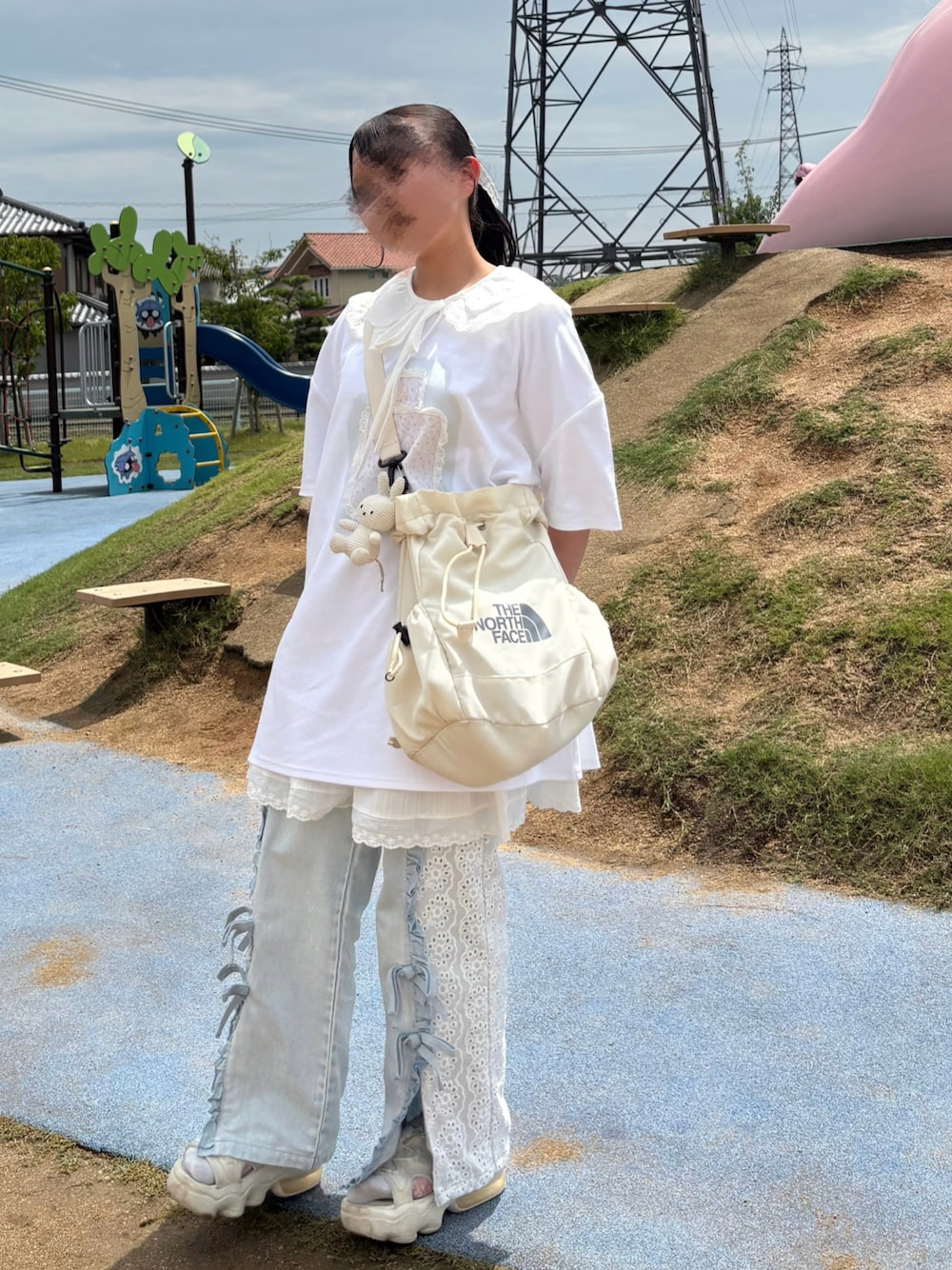 らくちんでお気に入りのコーデ☁️ プチプラのつけ襟とスカート活躍させられてうれしい♩ (Tシャツの裾からレーススカート出したくて、だいぶ下で履いてます◎)
