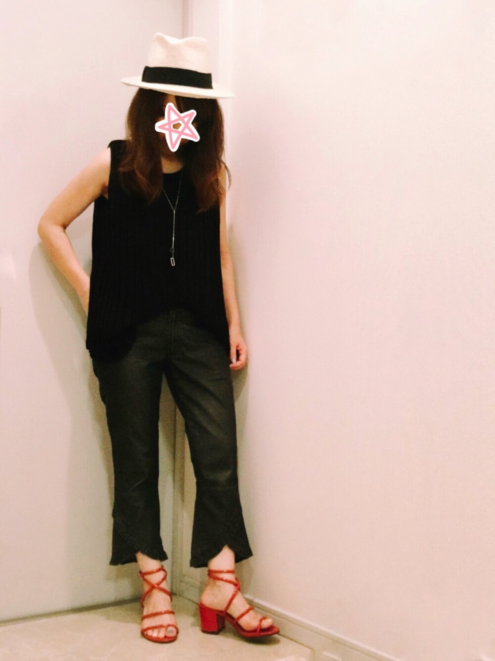ブラックコーデ。赤のサンダルがポイントです。 このパンツ、裾がフリルになっていてかわいくて、でも丈が長かったので膝丈あたりで自分でカットして縫い合わせてクロップド丈にしたオリジナルです。笑