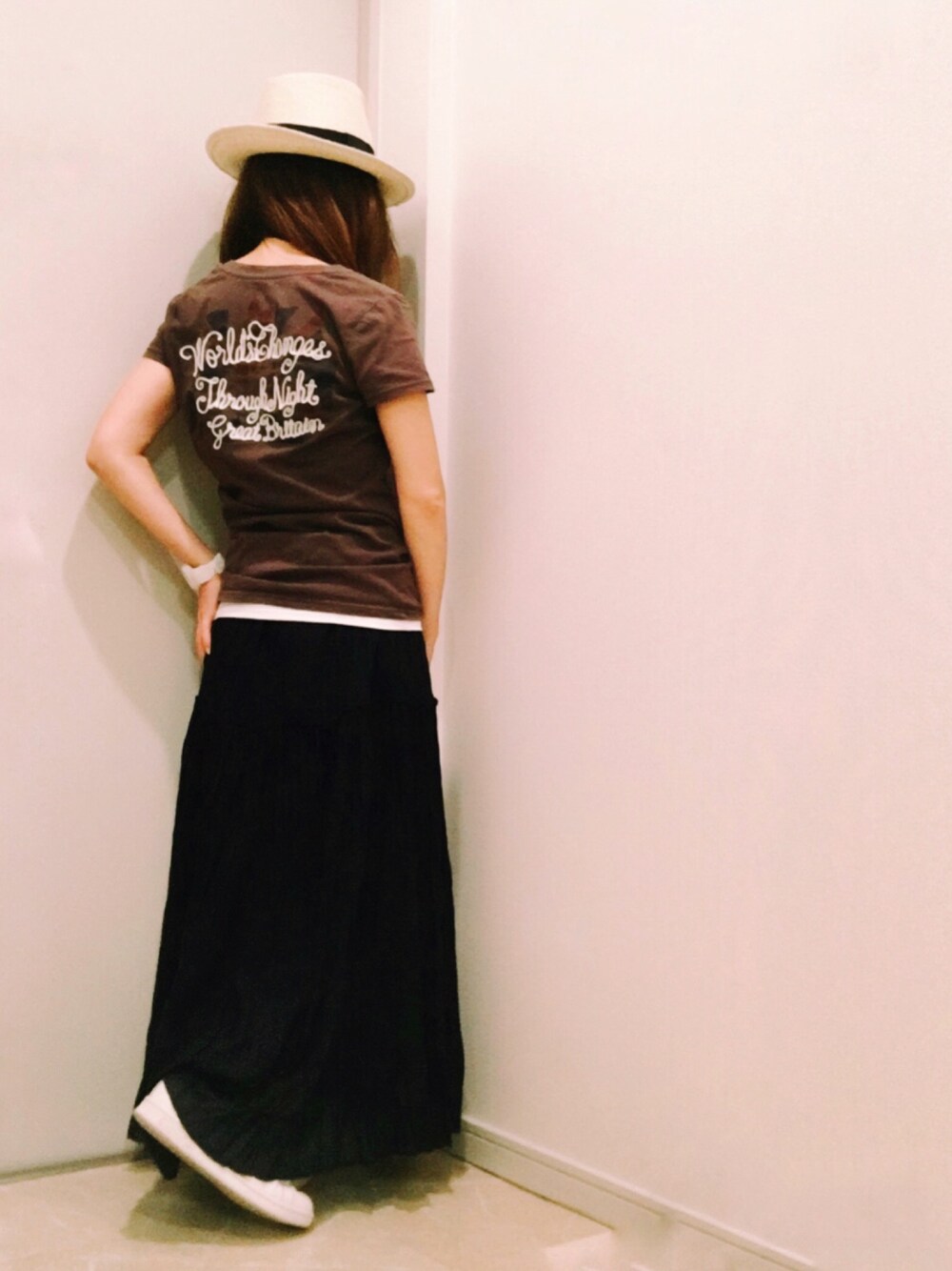 バックの刺繍がかわいいTシャツ。刺繍の下はさりげなく迷彩っぽくなっています。 Tシャツの裾からタンクトップの白をのぞかせるのが大ポイント。このレイヤードがあるかないかで大きく違う気がします。