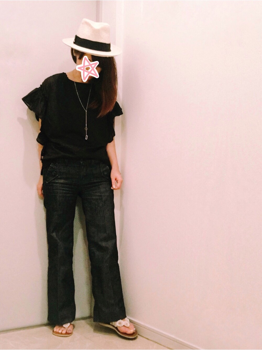 また袖フリル。で、今日はブラックコーデ。 ちょっとキレイめのビーサンでラフに。