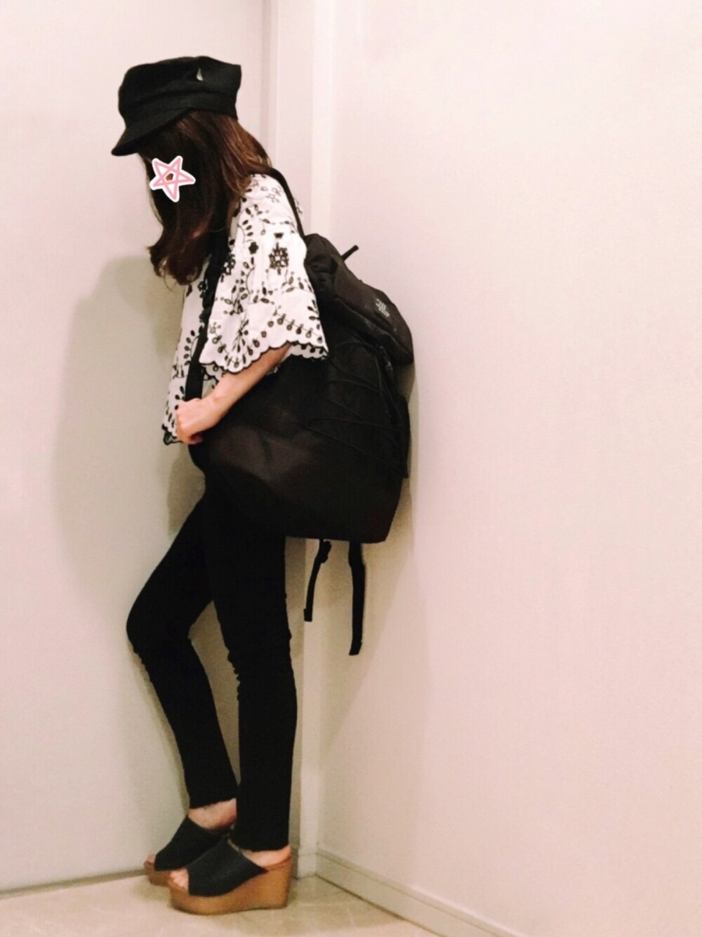 刺繍ブラウスがカワイイから、他は黒でクールめにしました。