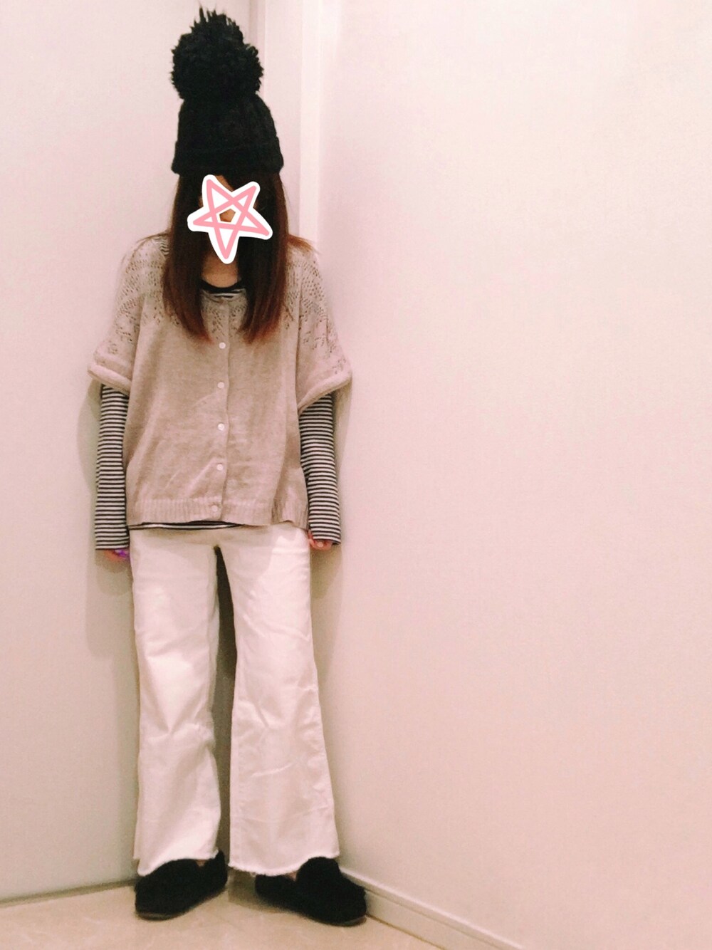 ゆるカジュアル。 ニット帽とファーモカシンの黒のサンドウィッチで引き締めました。