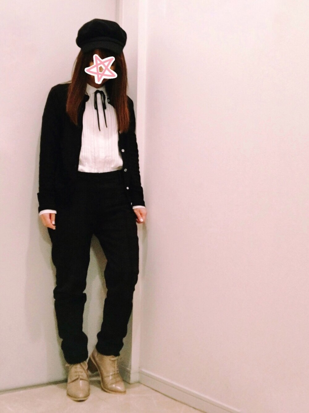 リボンタイのブラウスが着たかった日。 真っ黒に見えるけど、パンツはトラッドチェックで、メンズライクな感じになりました。
