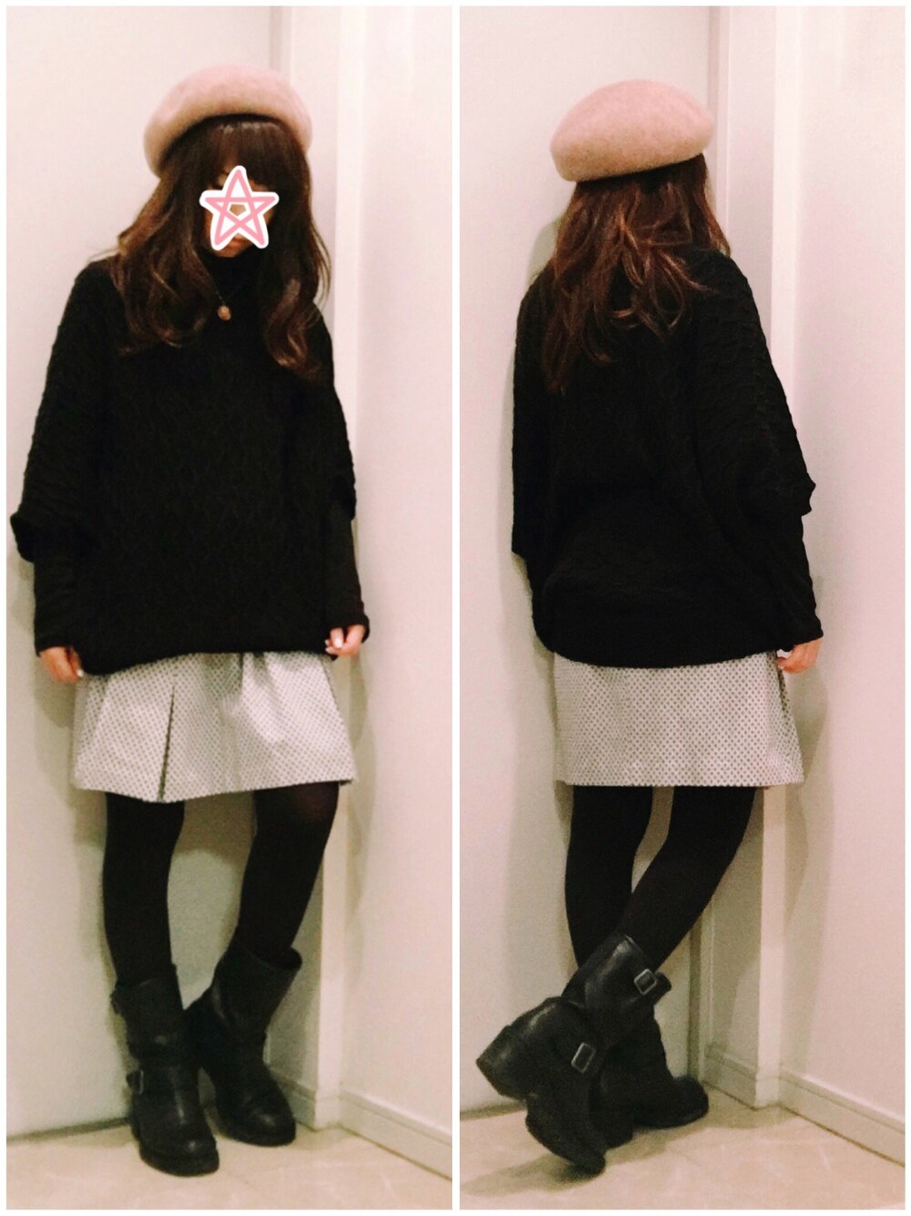 前はタックスカートだけど、後ろから見るとタイトスカート。 薄いグレーで白っぽいので、寒々しくならないように黒で締めて帽子だけちょっと色味を足しました。