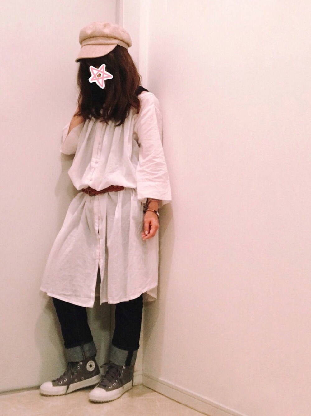 シャツワンピはベルトでウエストマークしました。