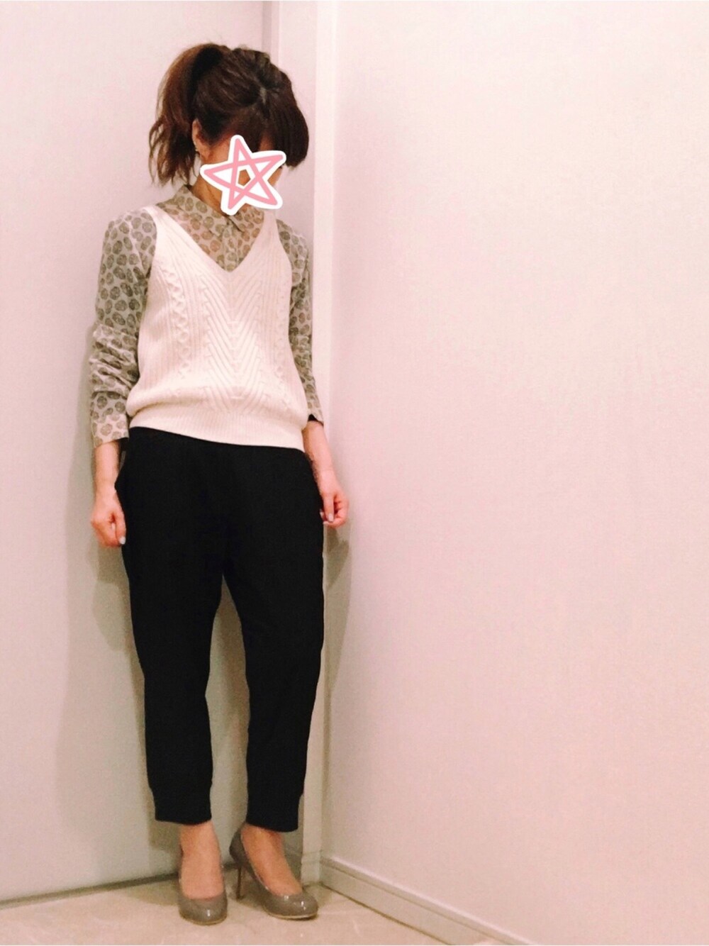 ニットキャミ。インナーは透け感のあるブラウスを合わせました。