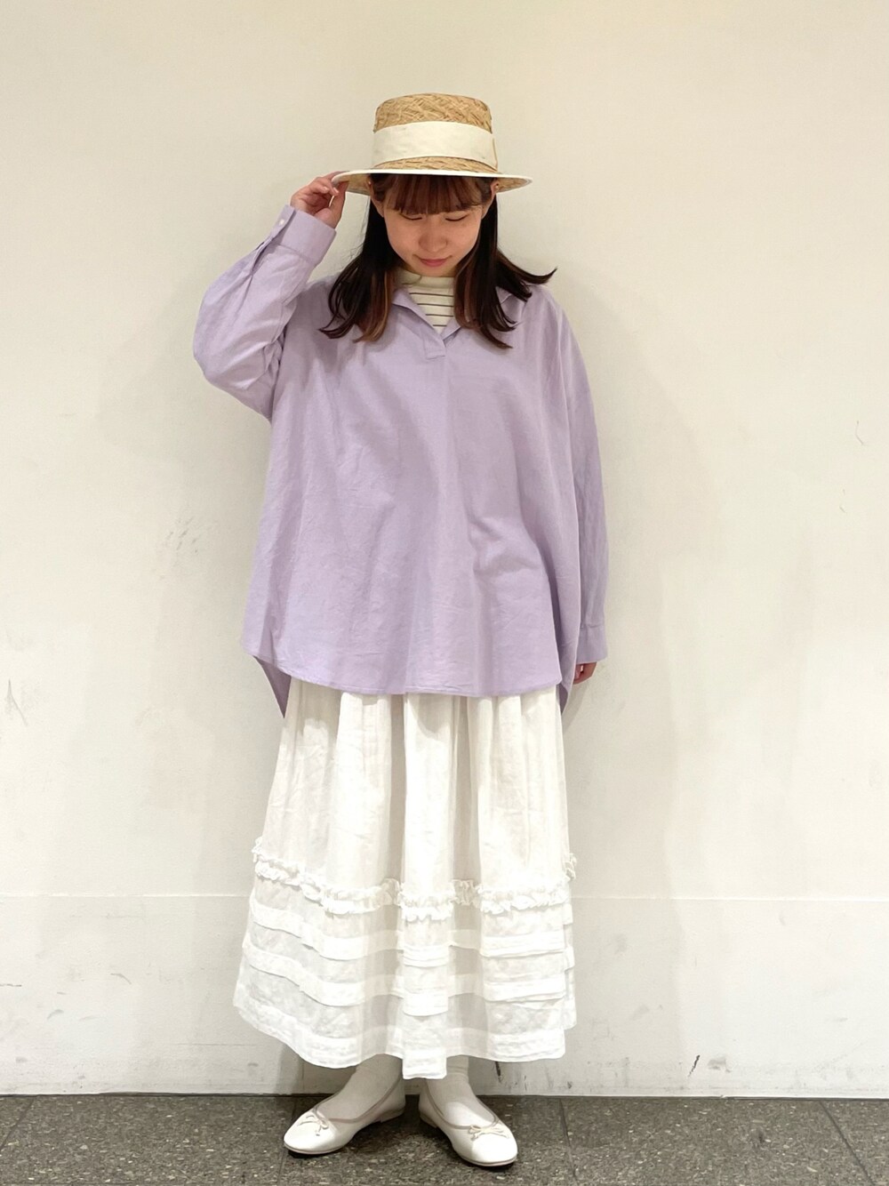 松のハット「ラフィア太リボンカンカン帽」を使ったコーディネート