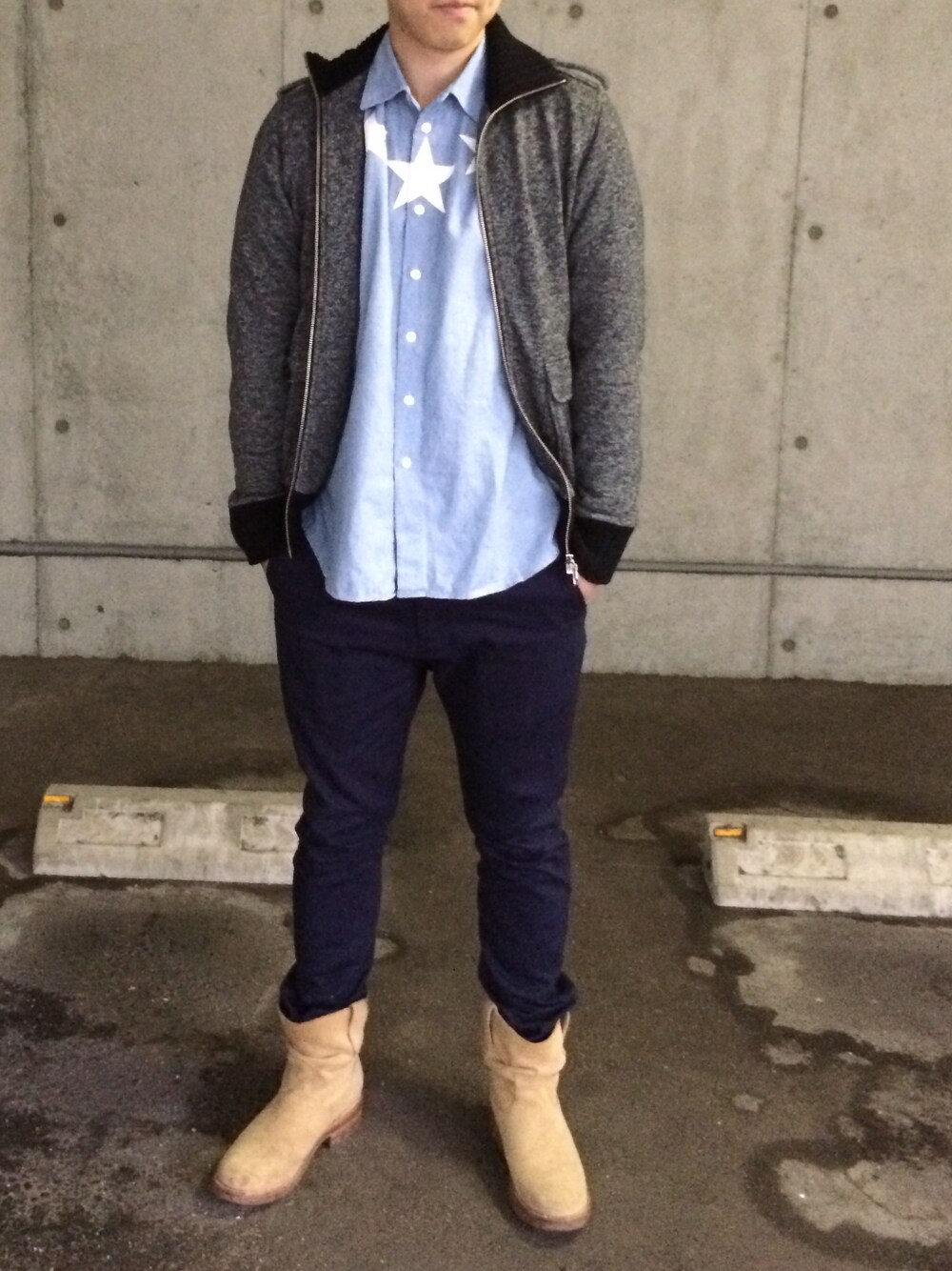 ブルーのシャツと紺のパンツの組み合わせ。寒かったのでジップアップブルゾンを羽織りました。