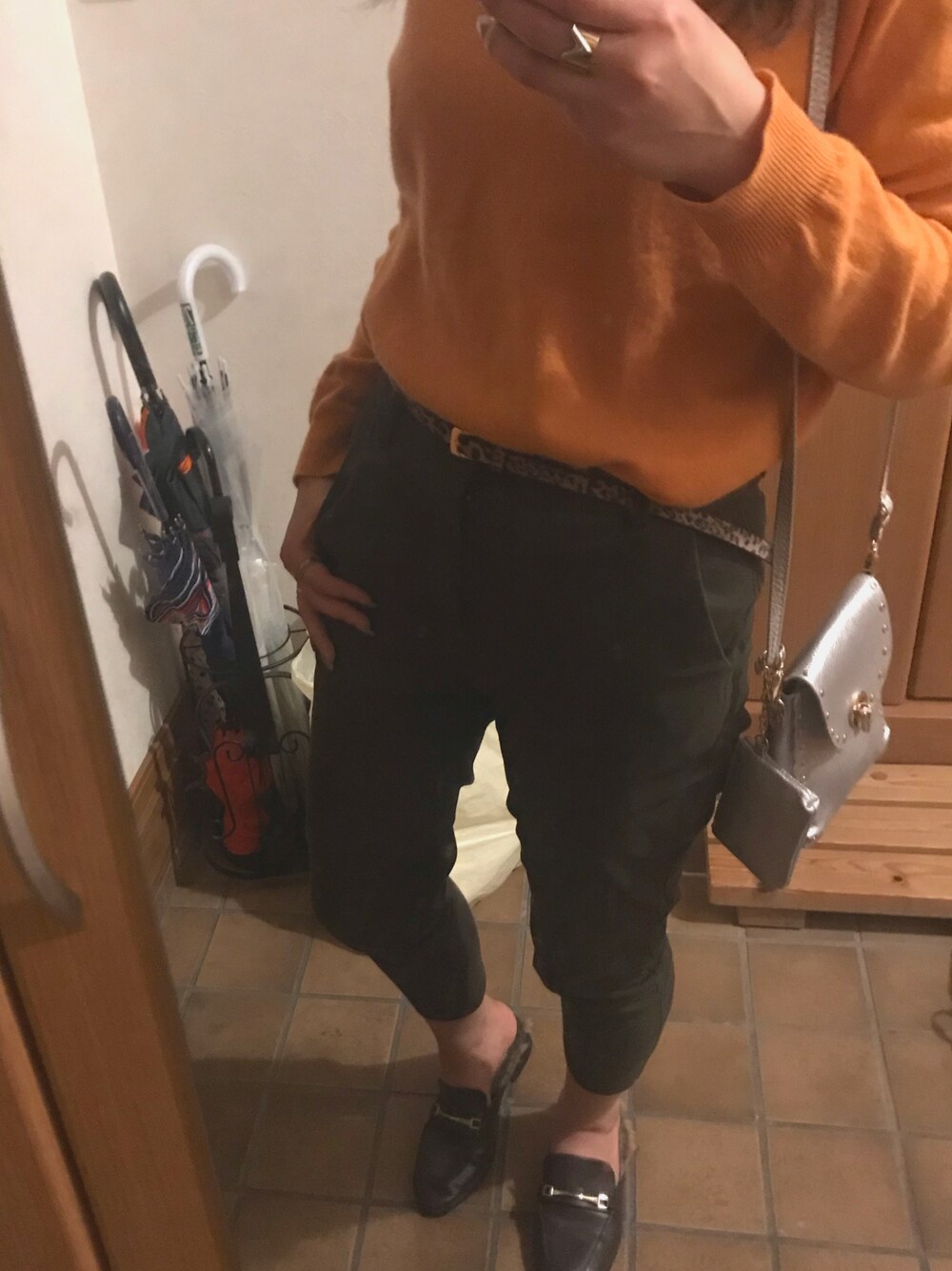 おじコーデの差し色にオレンジニット🍊 ショルダーバッグもシルバー ベルトヒョウ柄お気に入り