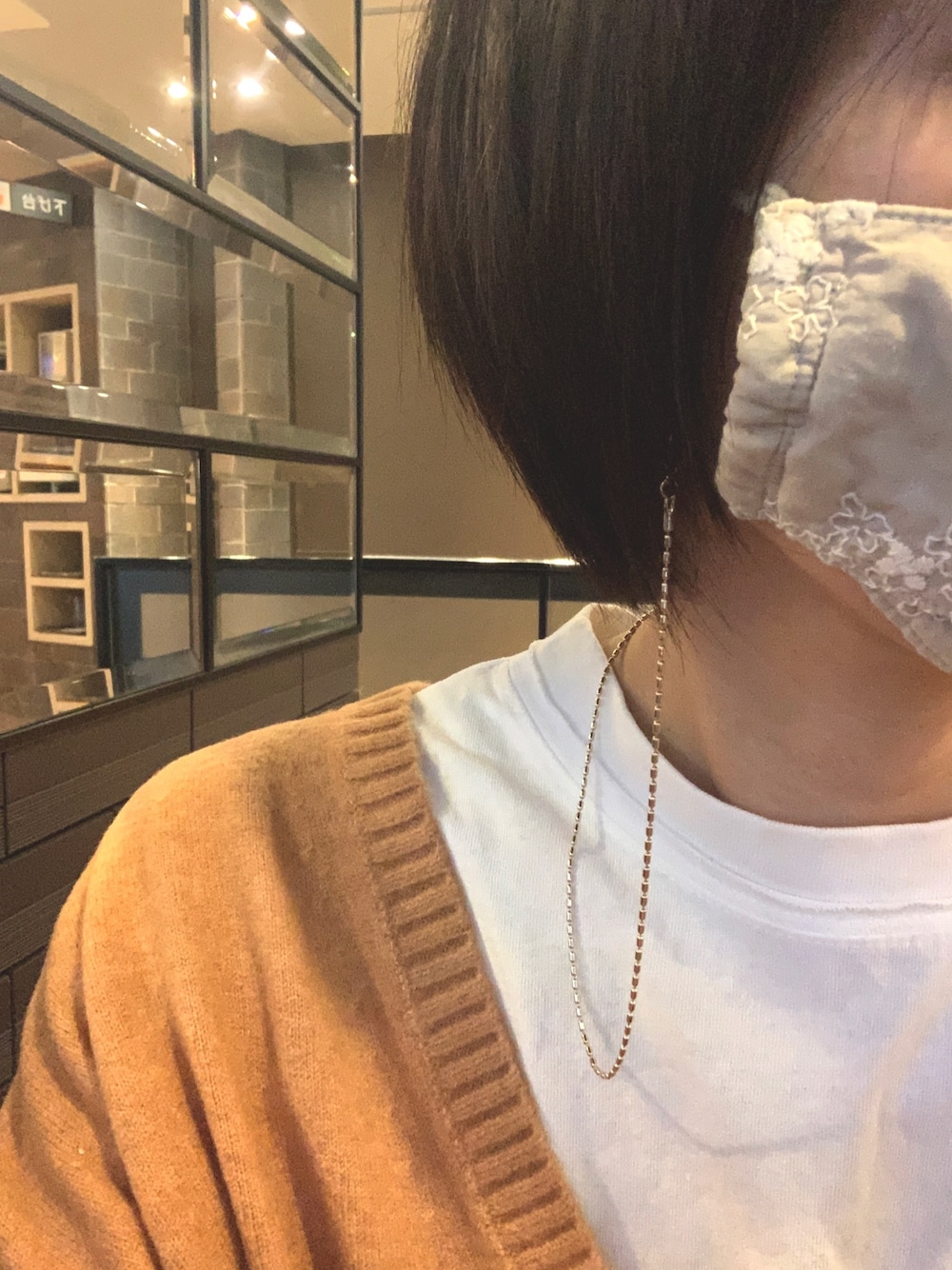 マスクストラップ使ってみました。 マスクを取って首にぶら下げることはあまりなさそうだけど、ピアスの代わりにアクセサリーとしてチラ見せするのは可愛いなと思います。