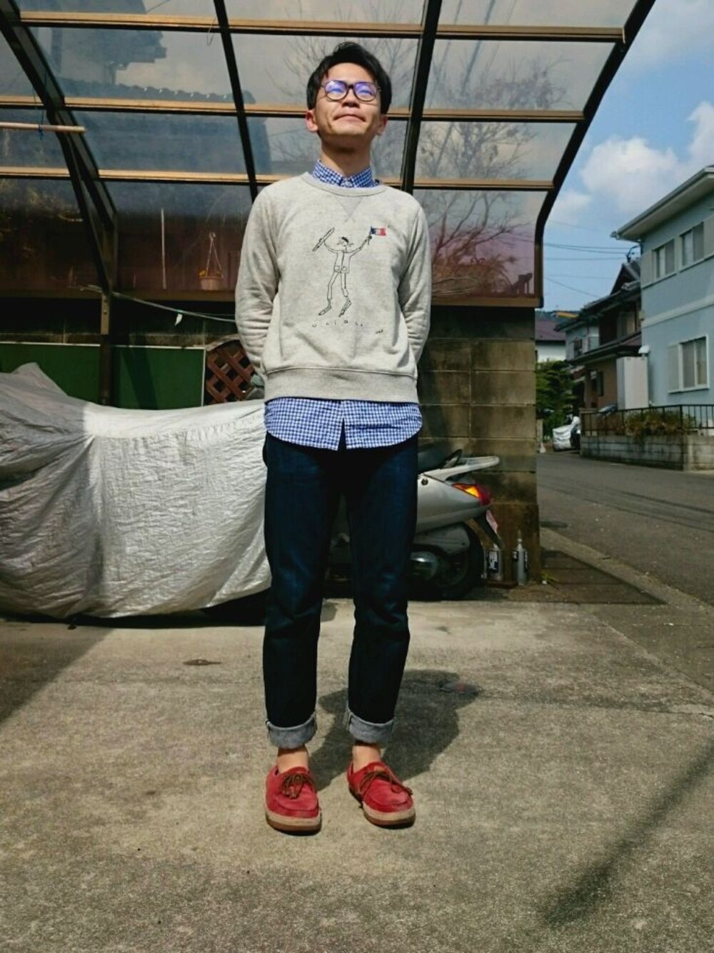 靴以外UNIQLO✌ 春っぽいかなと自分では思ってます。 全体的に着古してて、 とくに靴はぼろぼろです(汗) 味があるってことで受け取ってください😅 スウェットがお気に入りです。 イネスとコラボしてる 女性もののスウェット(XLサイズ)です。 素朴な感じと 何にでも合わせられる灰色なので 着まわしがききます✌ 今年のUNIQLOのメガネは デザインがいいと思います。 ふだん目が悪いのですが コンタクトの上から着用です(笑) 何より安いのがいいです。
