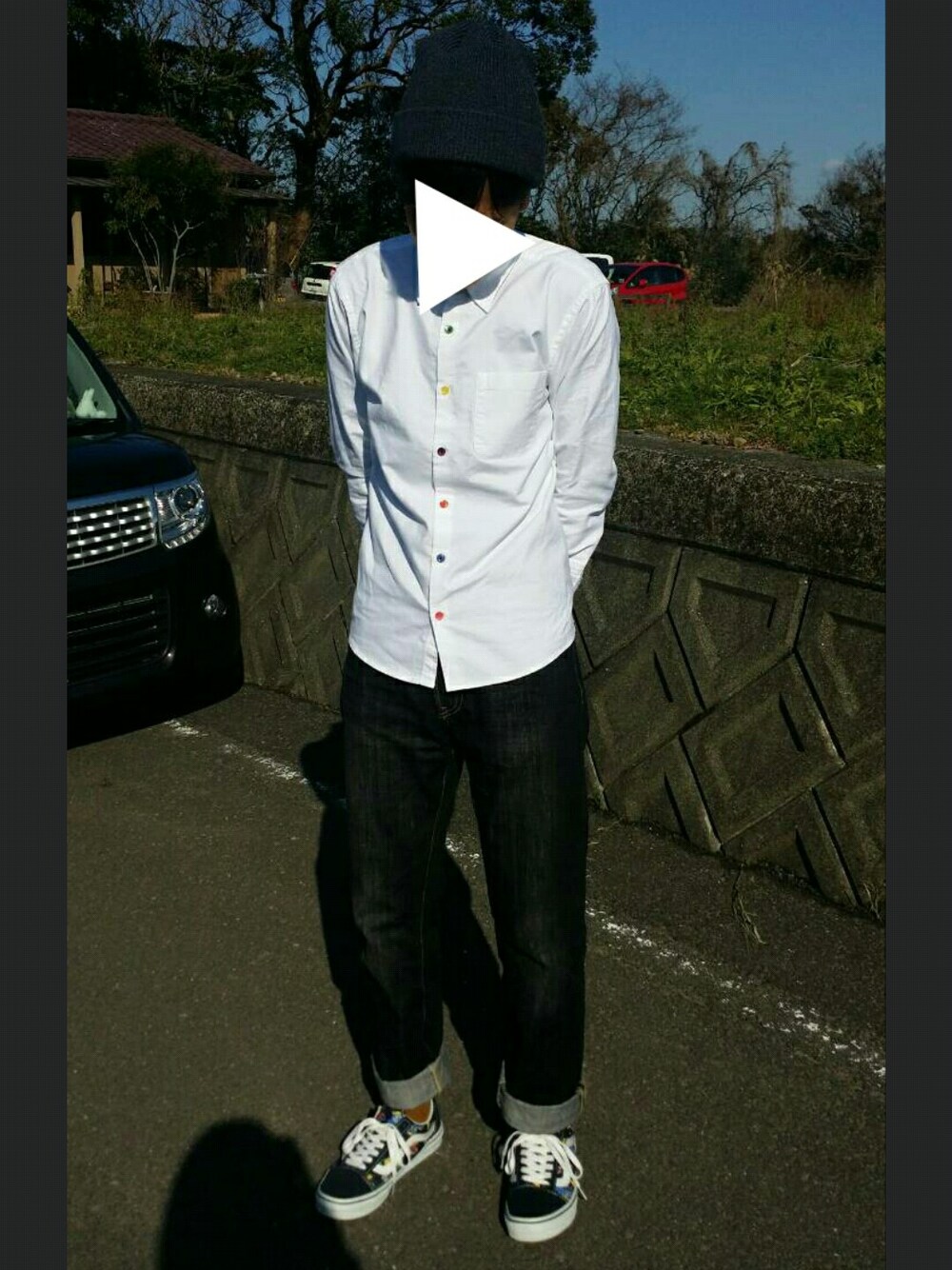 白黒コーデ! 小春日和の時に撮りました。 スニーカーとシャツのボタン あと靴下に色が入ってます。 なかなか好きな組み合わせです✌