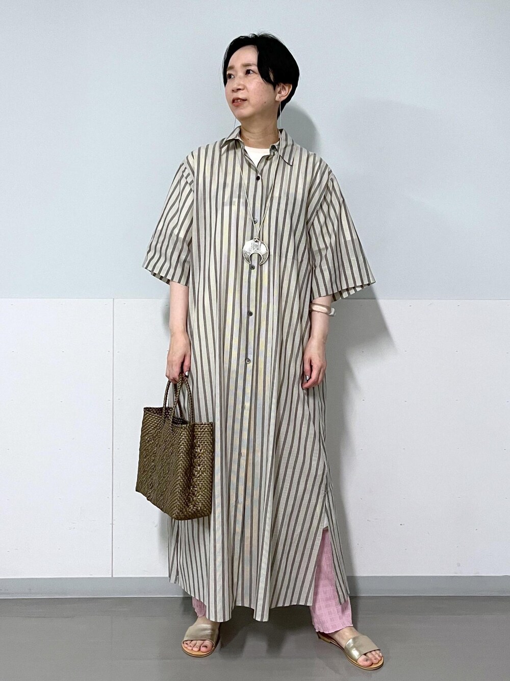 店長のシャツワンピース「ワッシャーローンシャツワンピース / 無地・ストライプ」を使ったコーディネート