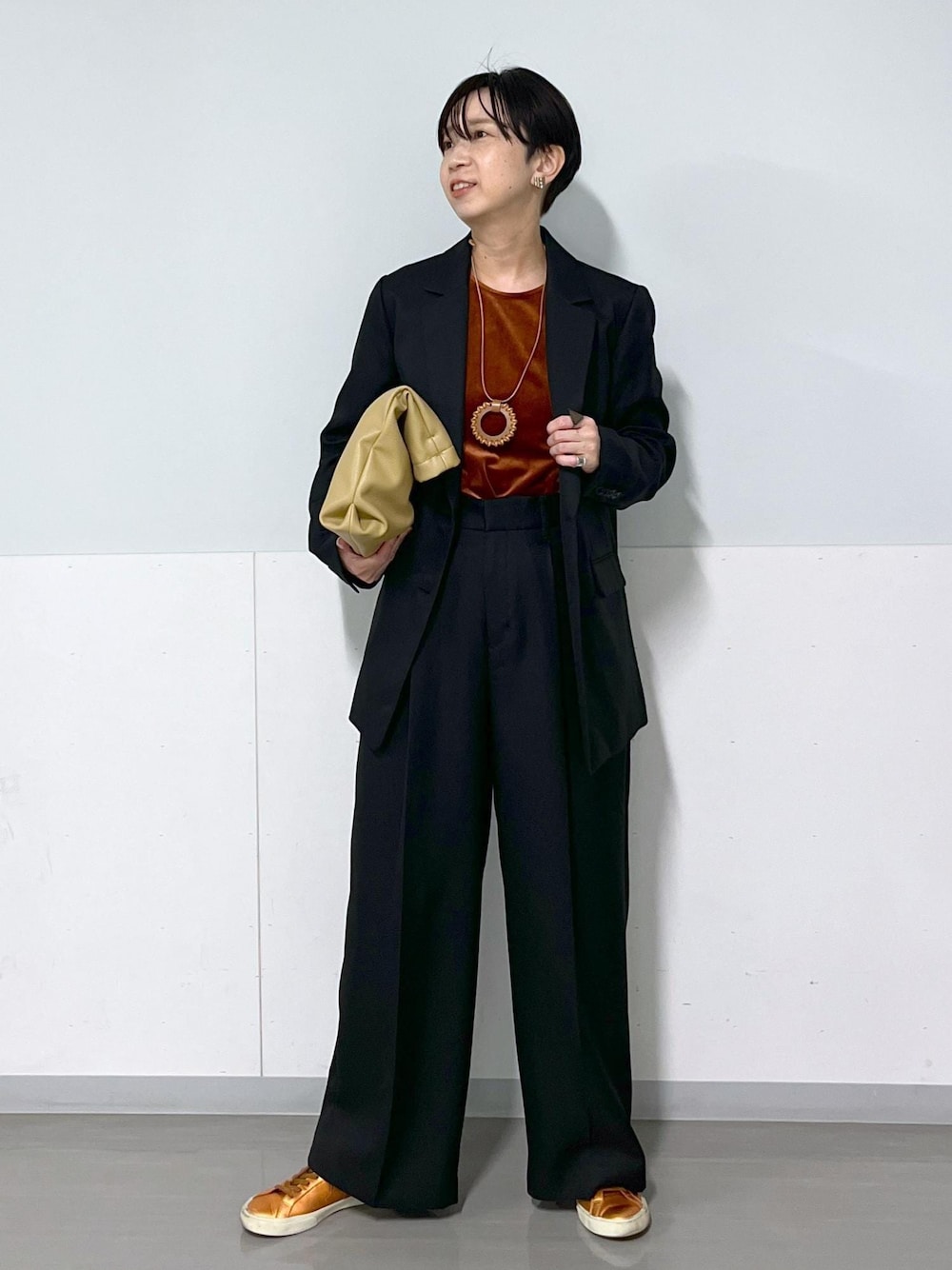 ジャケット/S パンツ/M メランジシリーズから こちらは鉄板の黒 ベージュや茶色はメランジ感が目立つので お洒落なイメージは引き立ちますが 黒はよりスレンダーに着こなせます 靴:私物