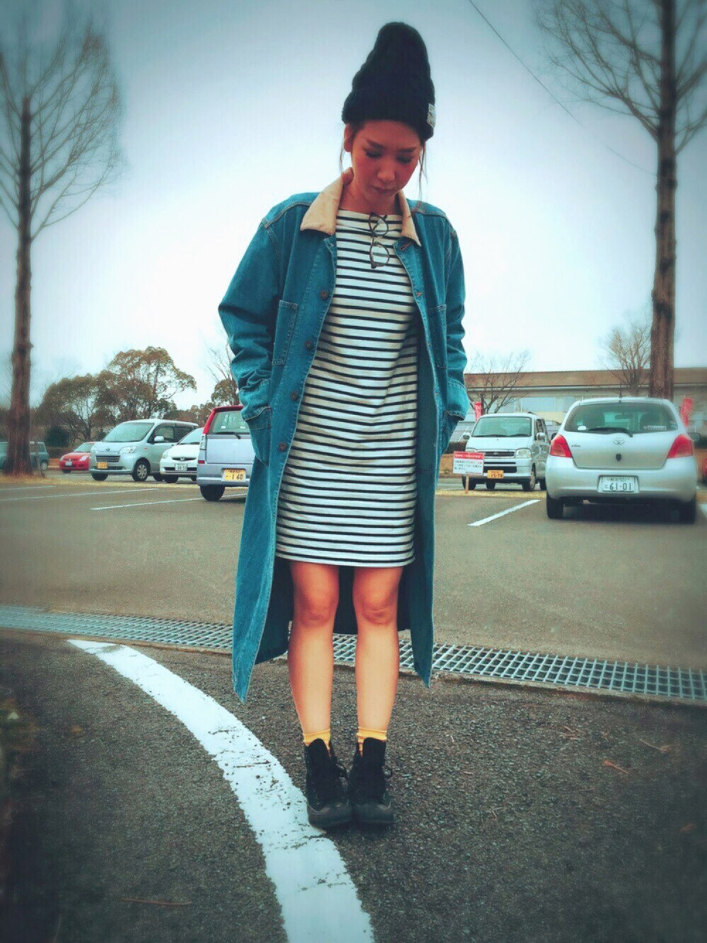 A713Yのチェスターコート「デニムロングコート」を使ったコーディネート