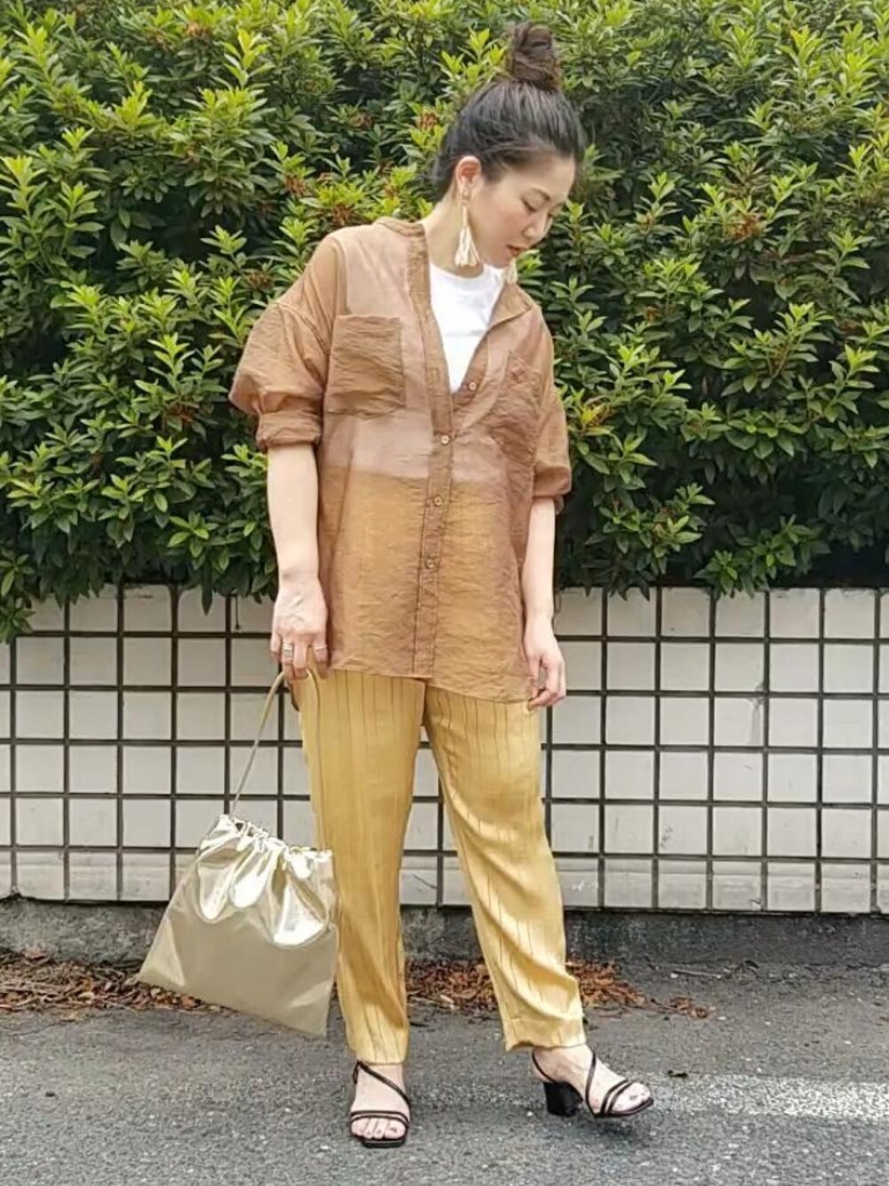 今季トレンドのシアーシャツとサテンパンツを組み合わせたコーディネートです◎ 透け感が楽しめるシアーシャツは、今季マストなアイテムですよね! そして、これからの夏にさらりと合わせたいのサテンパンツは、光沢感があるので気分も上がります♡