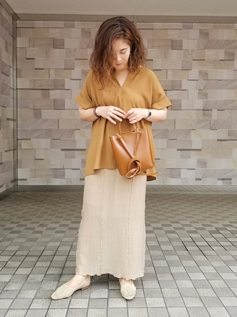 ベージュ系カラーでワントーンにまとめました。 どちらも、ソフトな透け感があり、とっても涼しいです◎ ベージュやキャメルなどのカラーは、夏から秋口まで活躍間違いなしですね◎