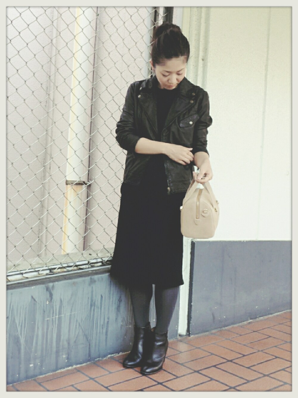 オールブラックでモードなスタイリング ライダースは、着まわしするのに 1枚は持っておきたいアイテム ミモレ丈スカートなどに合わせても◎!