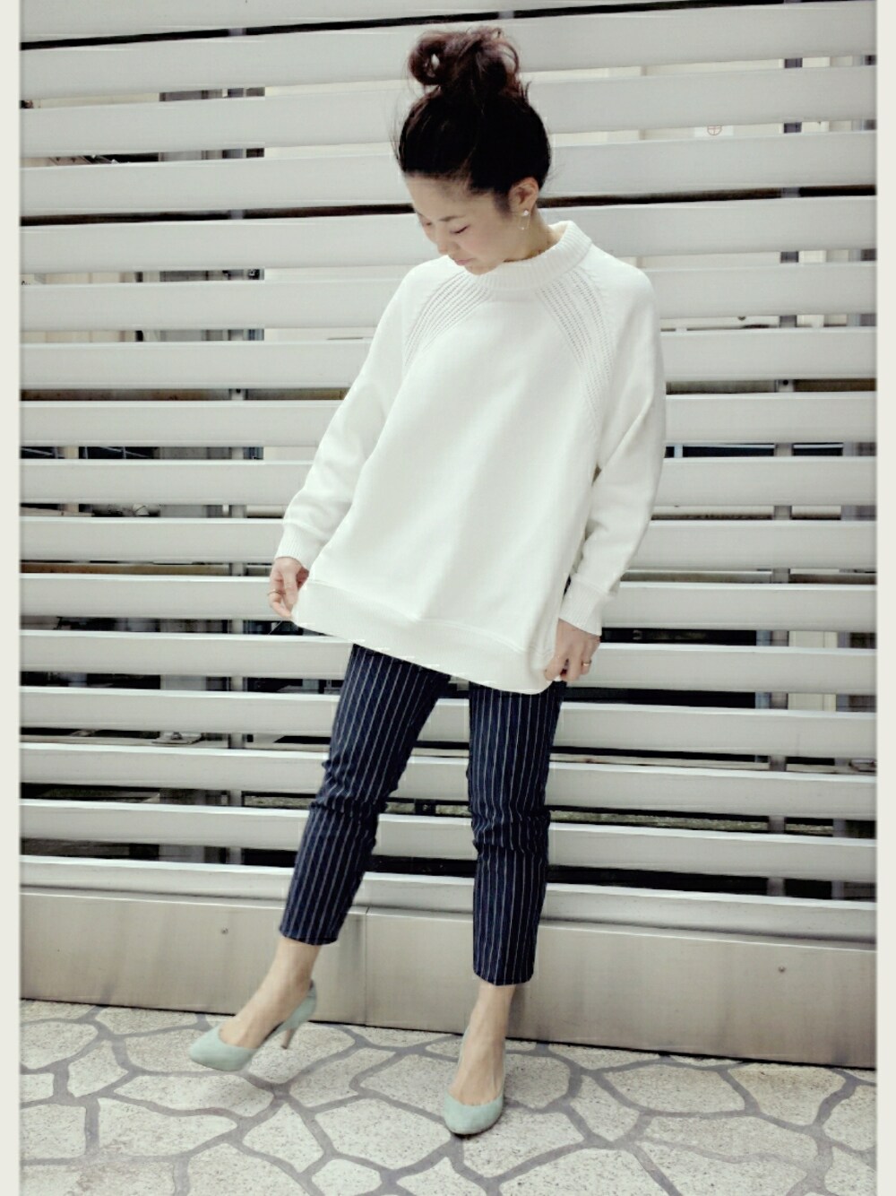 トレンドでもあるハイネックのニットプルオーバー 横に大きめのスリットが入っているのがポイントです 少し長めのチュニック丈なので タイトなボトムをあわせることで メリハリのあるコーディネートに! 足元にはパステルグリーンのパンプスを合わせて 春を先取りコーデです