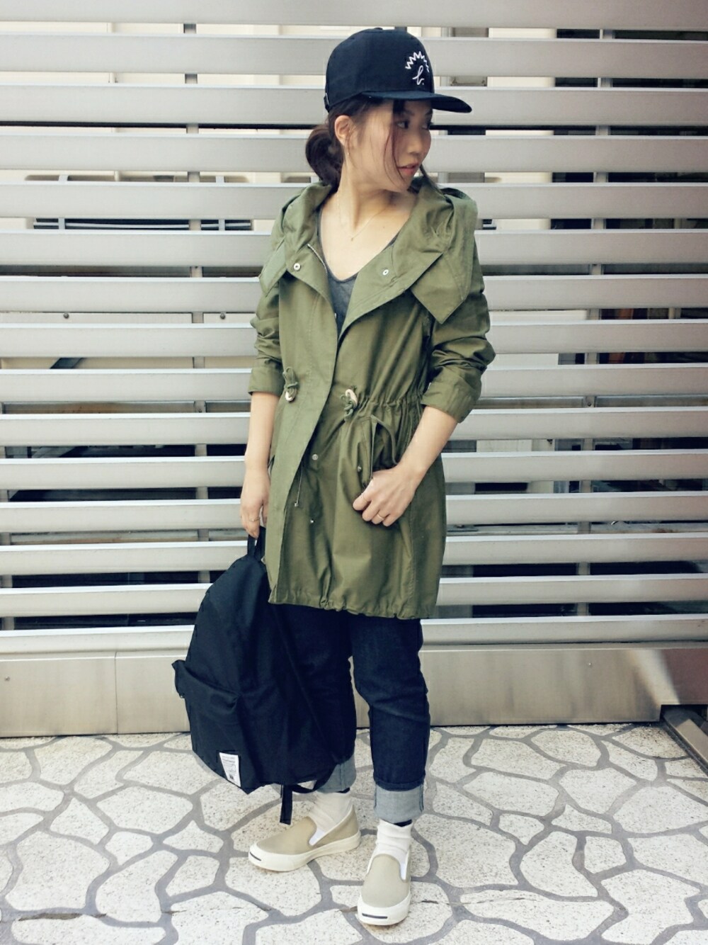 モッズコートにキャップにリュックという かなりカジュアルな合わせには どこかに女性らしさは残したいですよね。 フード部分を横に広げて 抜けるように着ることでスッキリさせました。 デニムの裾は、幅広で折るのが今年の気分。 ソックスをちらりと見せて楽しみましょう☺