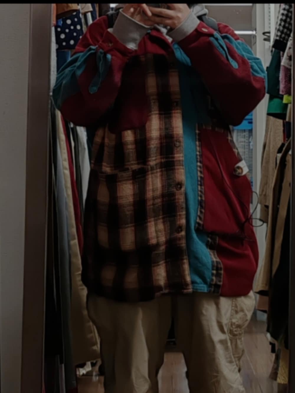 チャイハネ/Aminaで買った服 ラルダメンズシャツという名前?かな とGUかユニクロのズボンとパーカー 色好きすぎて着すぎて生地傷んできてかなしい