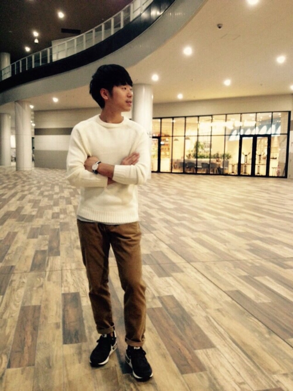 柔らかい印象を与える白ニットに秋冬らしいコーデュロイパンツを合わせました。 時計はDaniel Wellingtonでアクセントに。