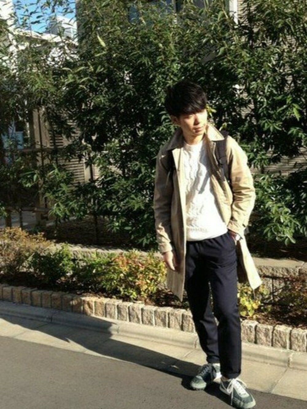 白のリブ編みのニットはコーディネートに加えるだけで柔らかい印象を与えます。 カッチリした印象のステンカラーコートにスニーカーとバックパックを合わせてカジュアルダウンしています。