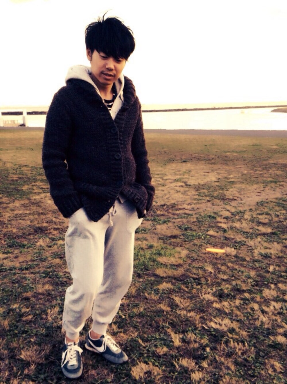 厚手のカーディガンアウターとスウェットセットアップのリラックススタイルです。 お休みの日に近くへ散歩に行くにも最適なスタイルですよ!