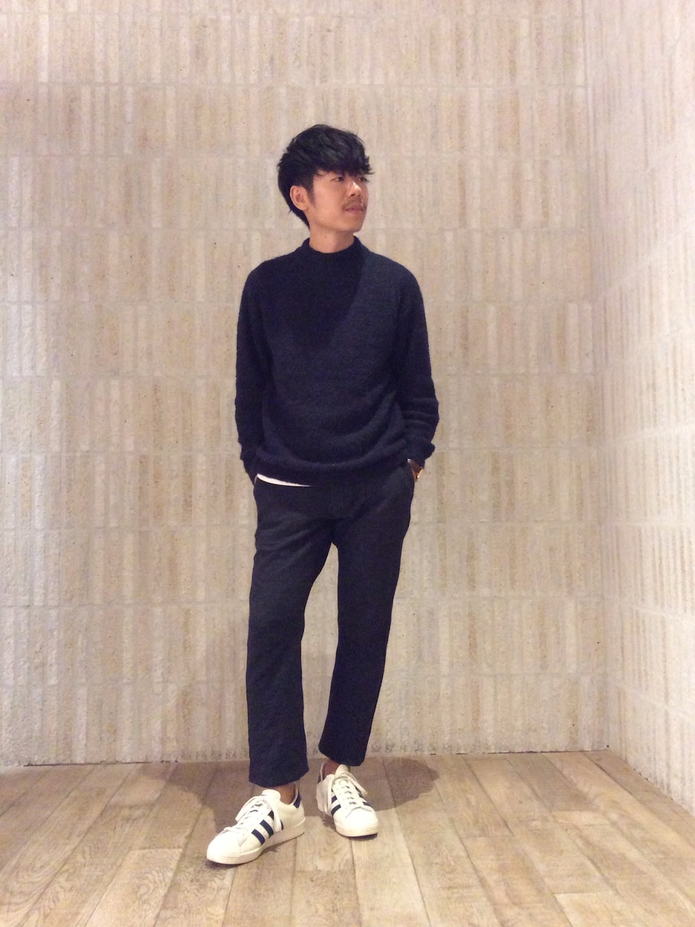 ネイビーコーディネートにアクセントの白スニーカーを選びました! ベビーアルパカのニットは暖かく着心地も抜群ですよ!