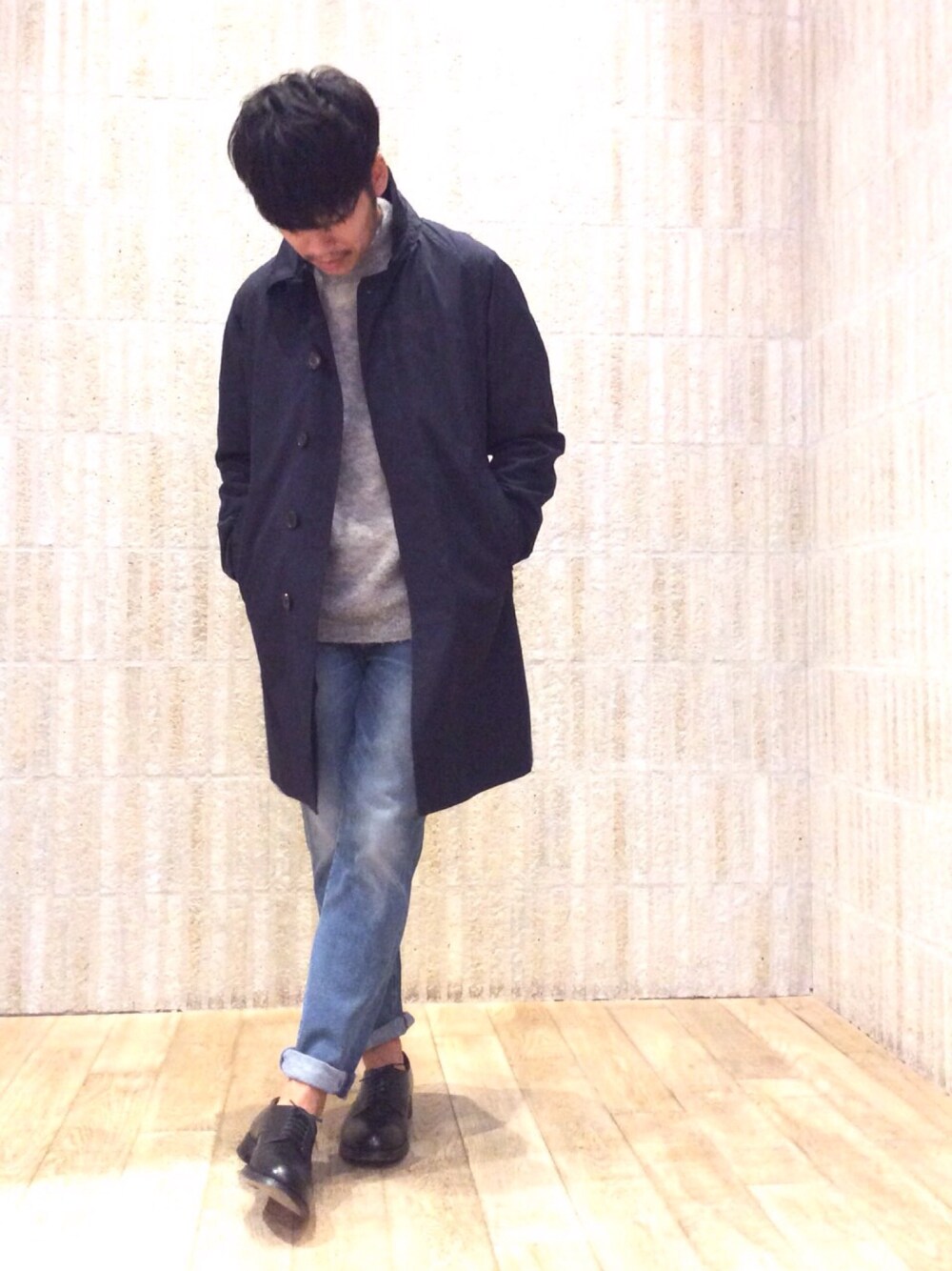 超撥水のステンカラーコートは傘になるコート! デニムとレザーシューズ合わせが気分ですね!
