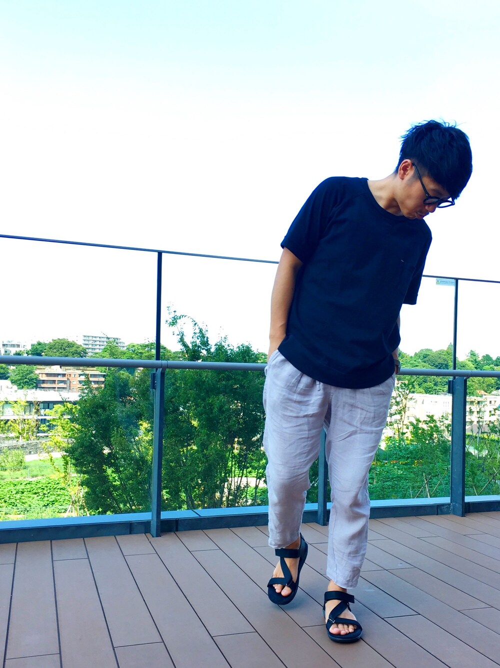 ブラック系のTシャツ/カットソーを着用したメンズの夏コーディネートの1枚目の写真