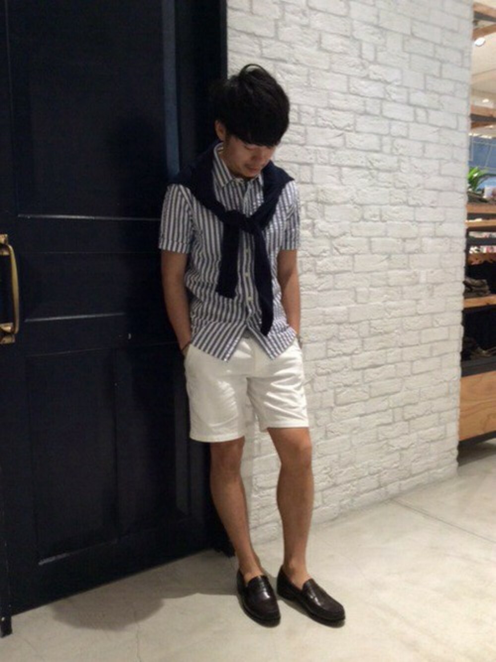 サッカー素材のストライプシャツにリネン混ショーツで爽やかにコーディネート。