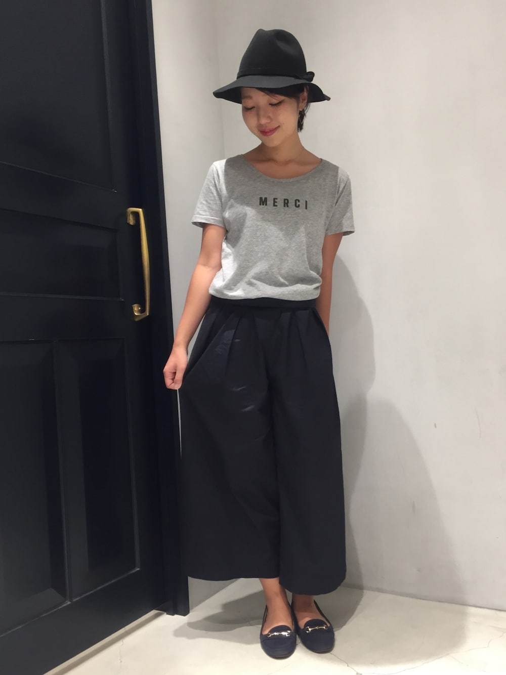ハリ感とシワ加工が初秋にGOODなガウチョウパンツにTシャツを合わせジャストなスタイリングに。 少し肌寒くなれば、トップスにニットを合わせたり、ソックスにヒールを合わせたスタイリングもおすすめです♪