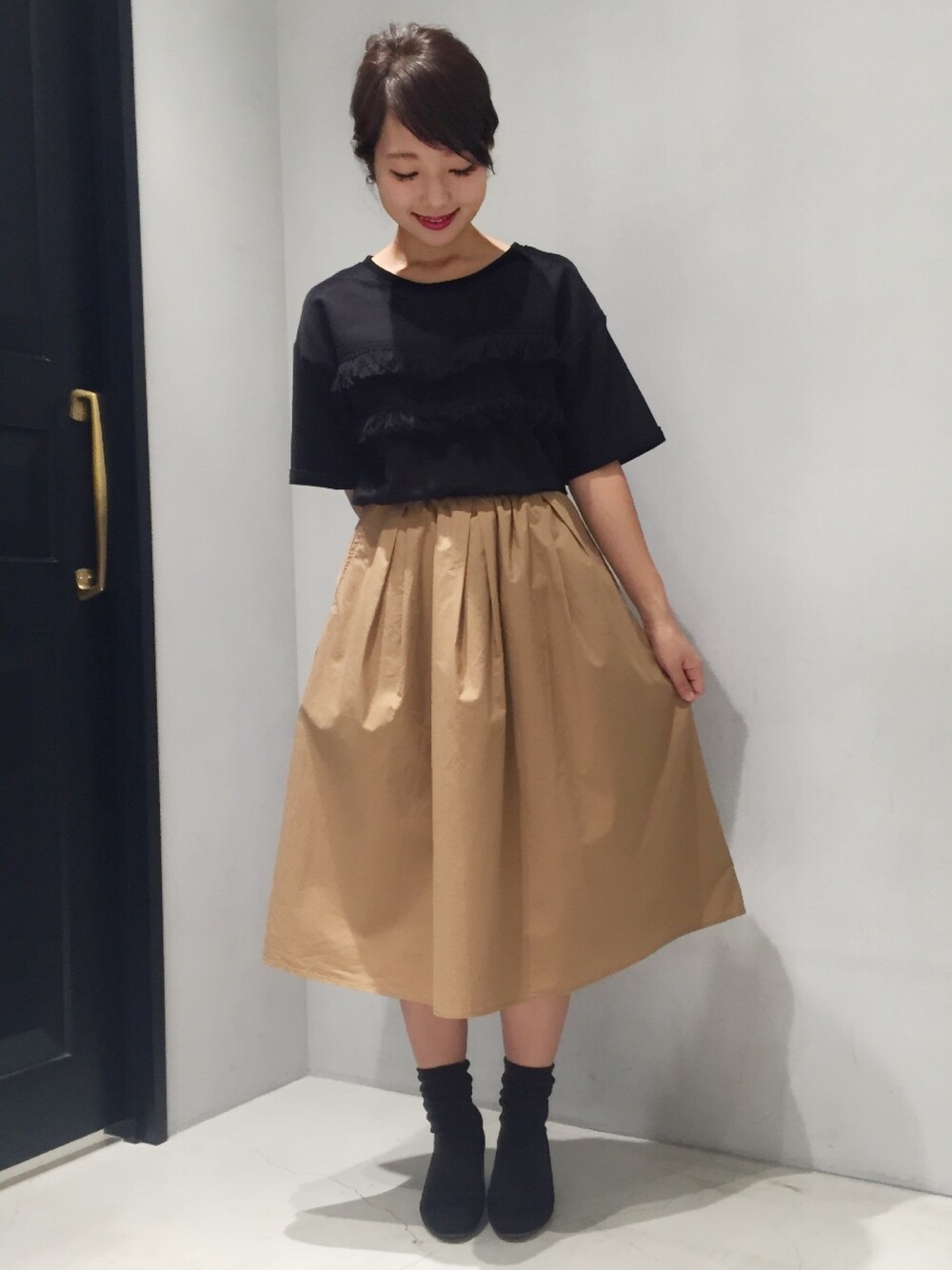 今年トレンドのフリンジトップスに、少しハリ感のあるコットンタイプライター生地を使ったスカートを合わせたコーディネートに! スカートはウエストを程よくシェイプし、タック&ギャザーをかけ、ボリューム感もたっぷり! ミニマルなデザインでトップスとも合わせやすく、コーディネート力抜群のアイテムです♪