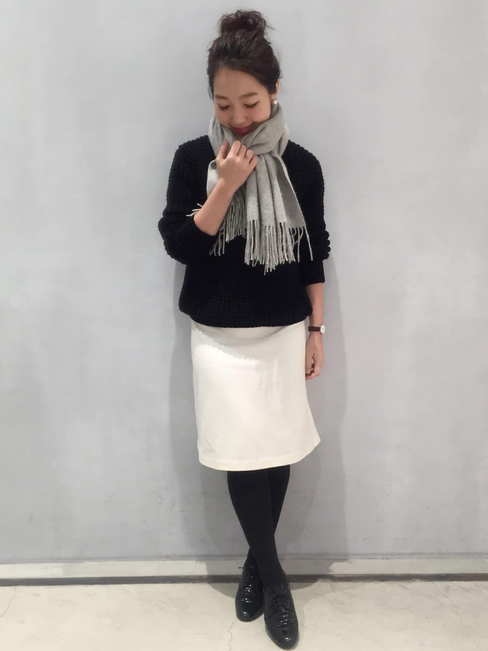ブラック&ホワイトの大人モノトーンコーディネート♪ 首元にストールを巻くだけでシンプルなコーディネートにもこなれ感がプラスされます!