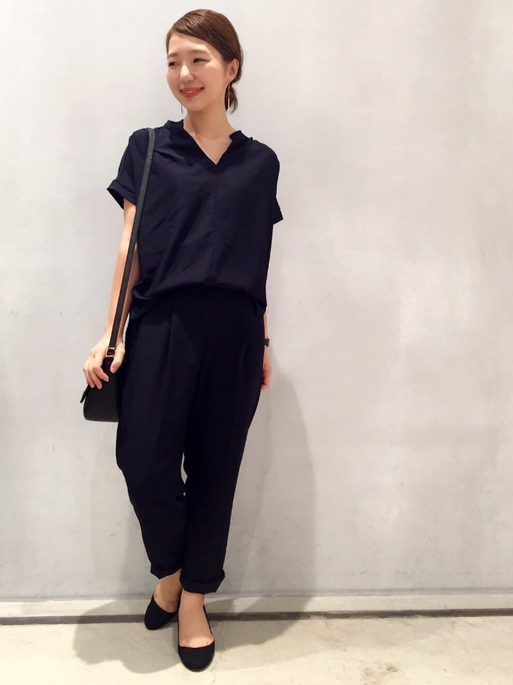 デコルテラインが美しくみえるスキッパーの襟のカットソーと脚長効果の細身タックパンツがセットに! ビジネスシーンでも対応できるよう、綺麗目素材に仕上げています♪ 細身のパンツはセンターにしっかりラインを入れることで、脚を綺麗にみせてくれます。