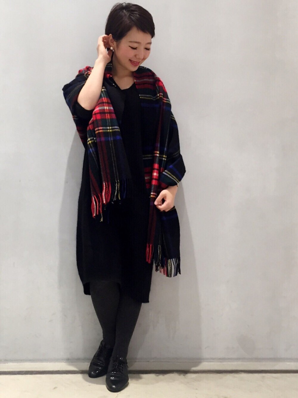 デコルテラインが美しくみえる深めのVネックワンピース♪ ふんわりとしたソフトタッチなアンゴラの素材感がポイント! チェックのストールでアクセントをきかせてます♪