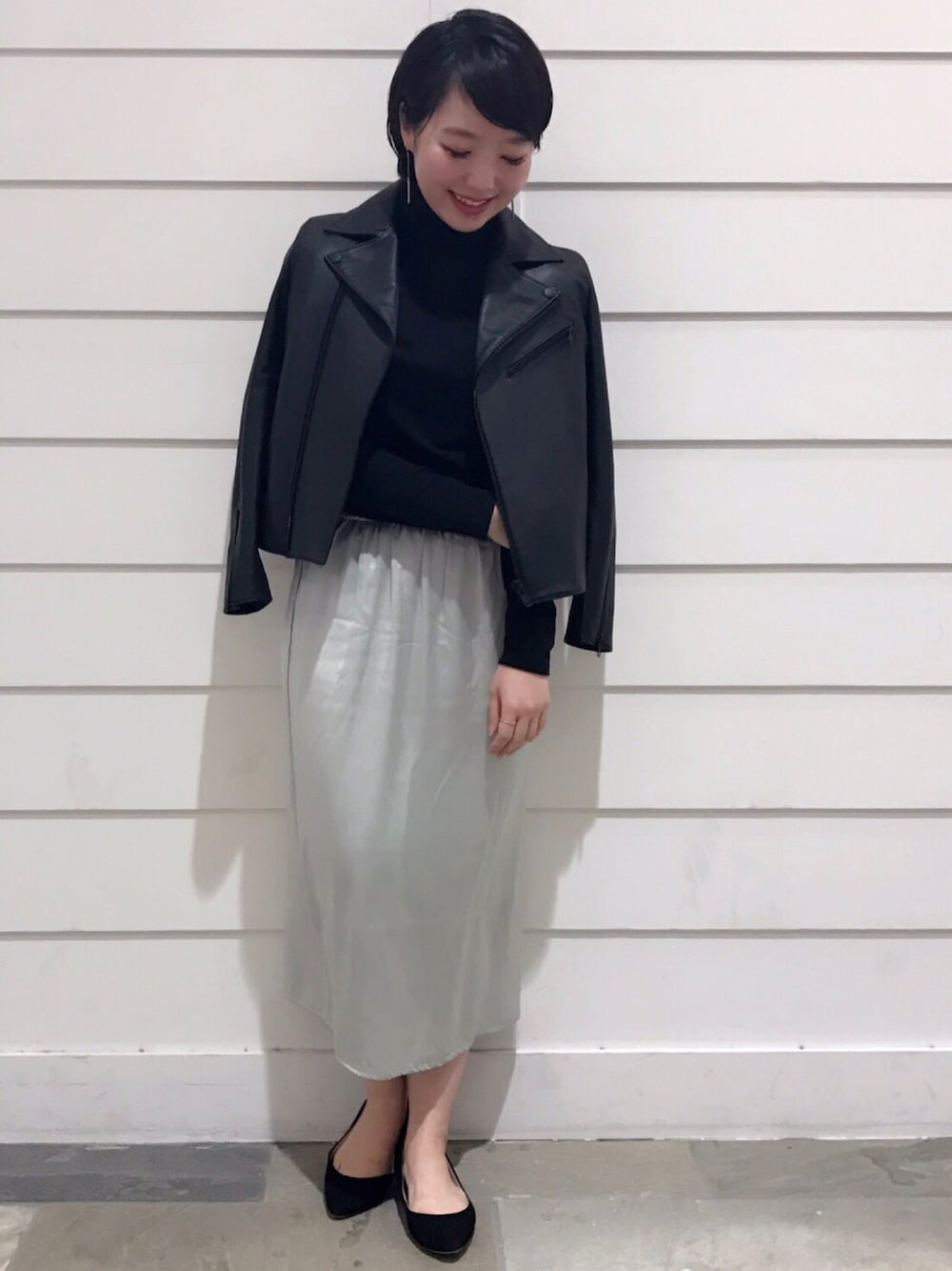 スタイルを選ばないベーシックなデザインとして、ながく愛用できるライダースは、ワードローブにぜひ加えたいアイテム!! シルクのスカートで女性らしいコーディネートに仕上げました。