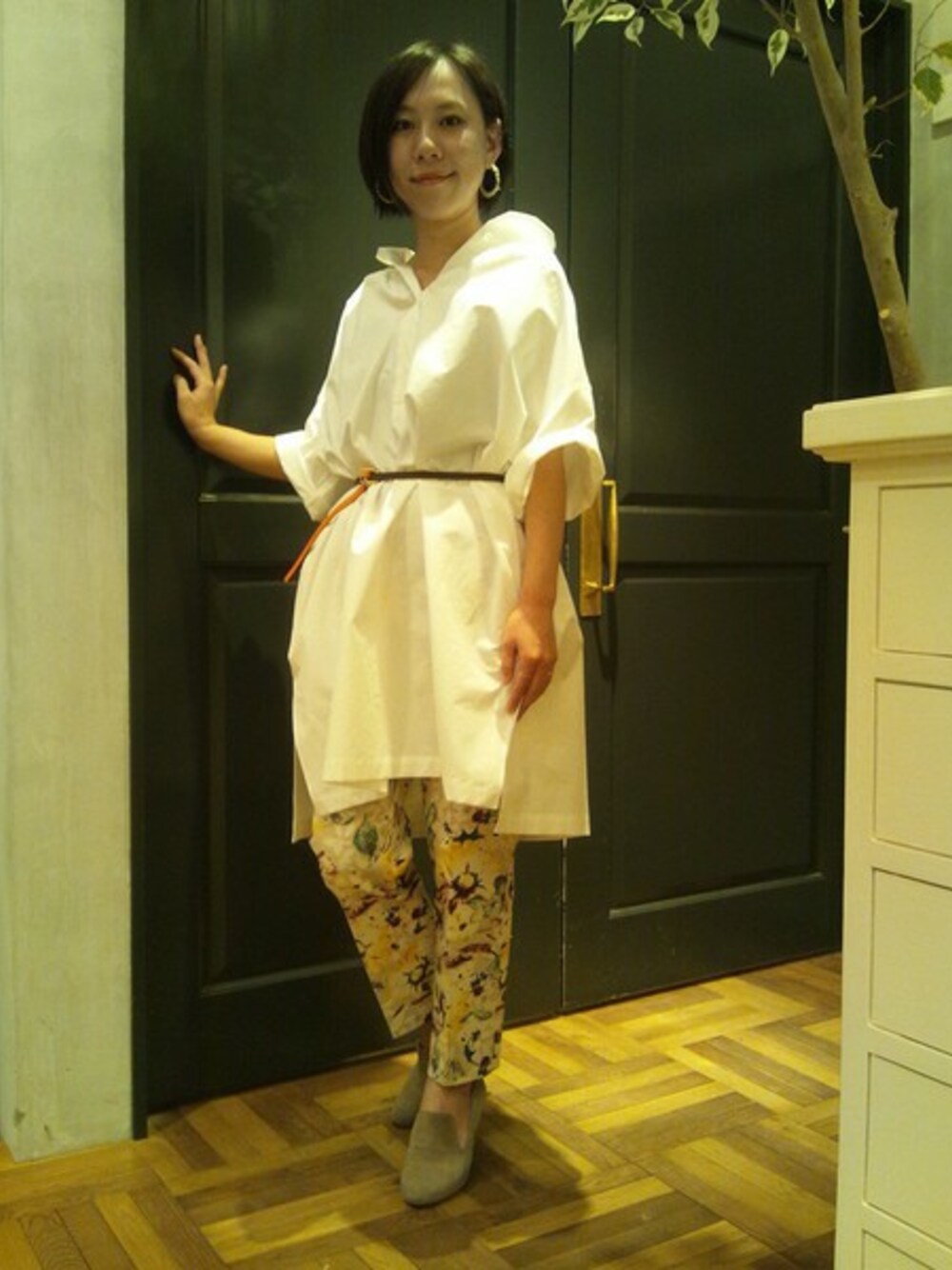 トレンドの大きめな花柄パンツをシンプルなシャツワンピースで合わせました!