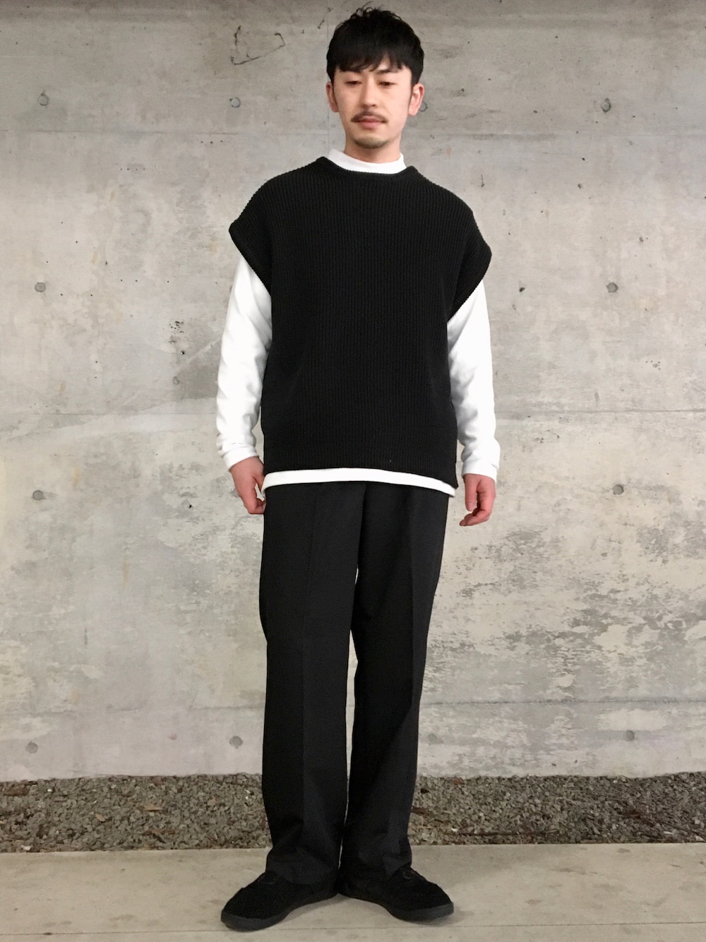 ご覧頂きありがとうございます。 春ベストを#モノトーン で 程良い肉感の畦編みでワイドシルエット、 深いサイドスリットもポイントです。 シンプルな色合わせですが、起毛感のあるモックネックと光沢感のあるワイドパンツで素材とシルエットに変化を持たせました。