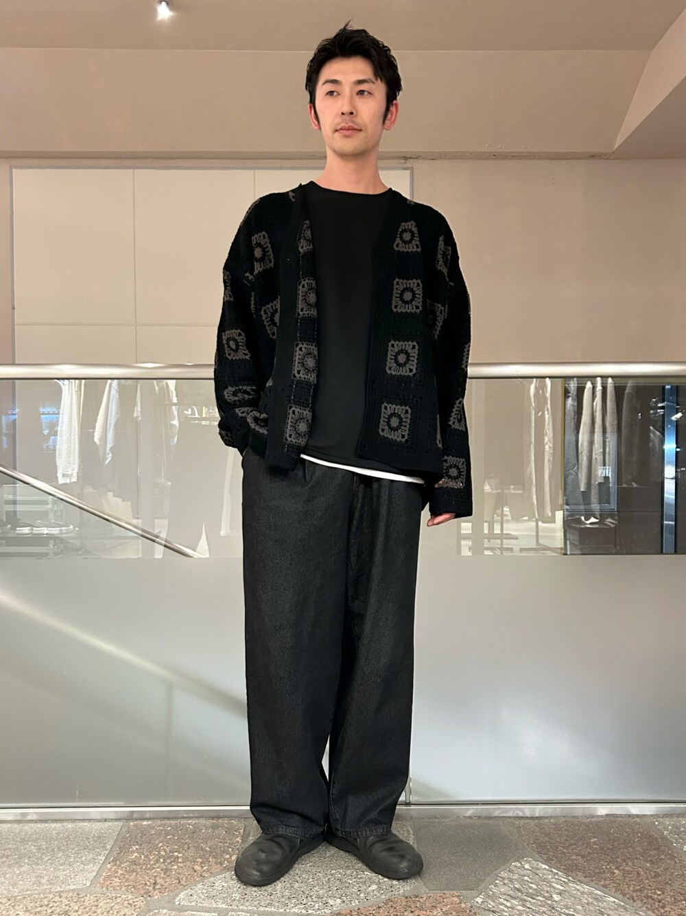 ご覧いただきありがとうございます。 クロシェルーズカーディガンがポイントのブラックコーデです!
