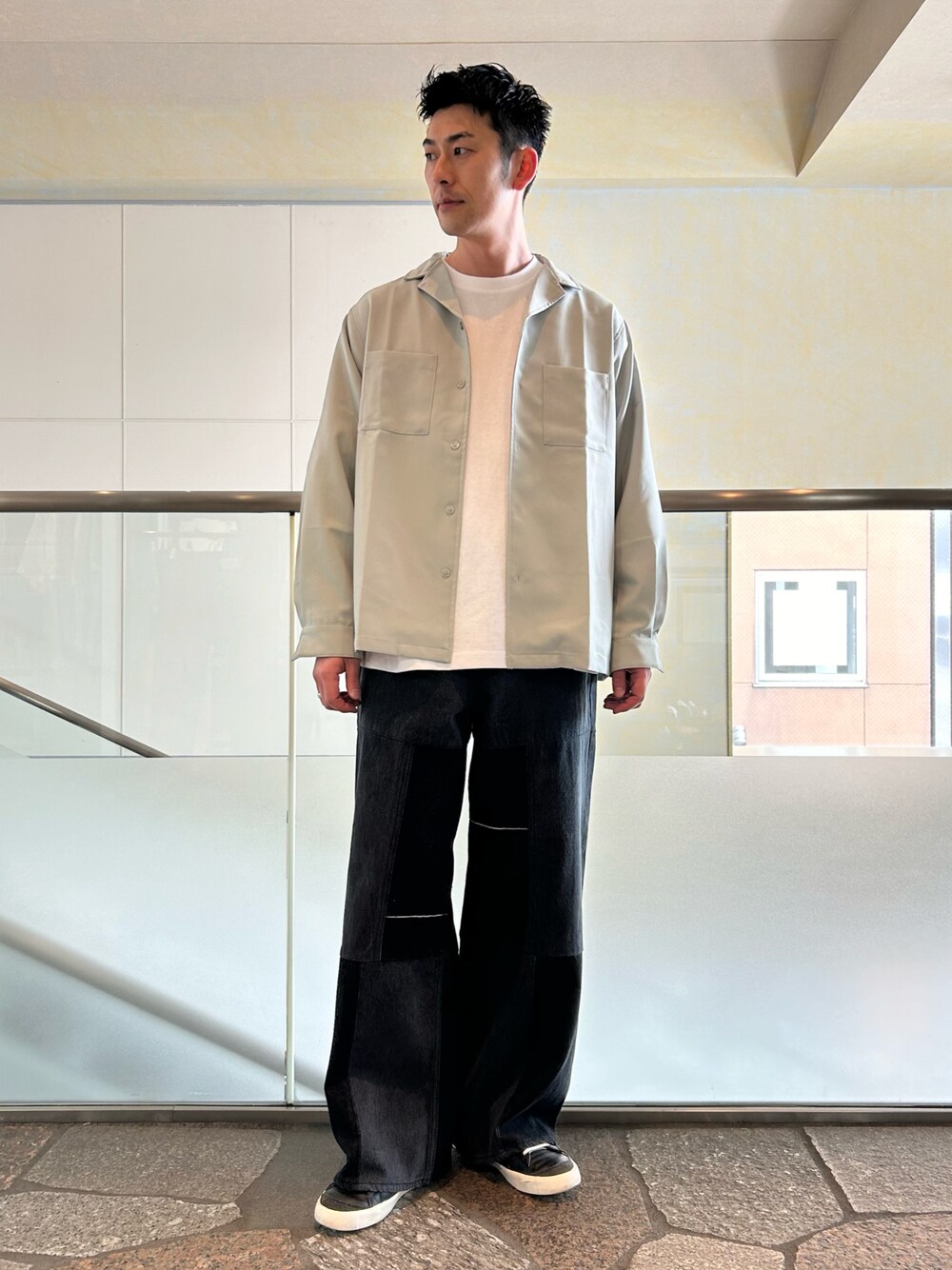 ご覧頂きありがとうございます。 ベーシックなトップスにパッチワークデニムを合わせたカジュアルコーデです。シャツはワンサイズダウンでジャストに近づけました。