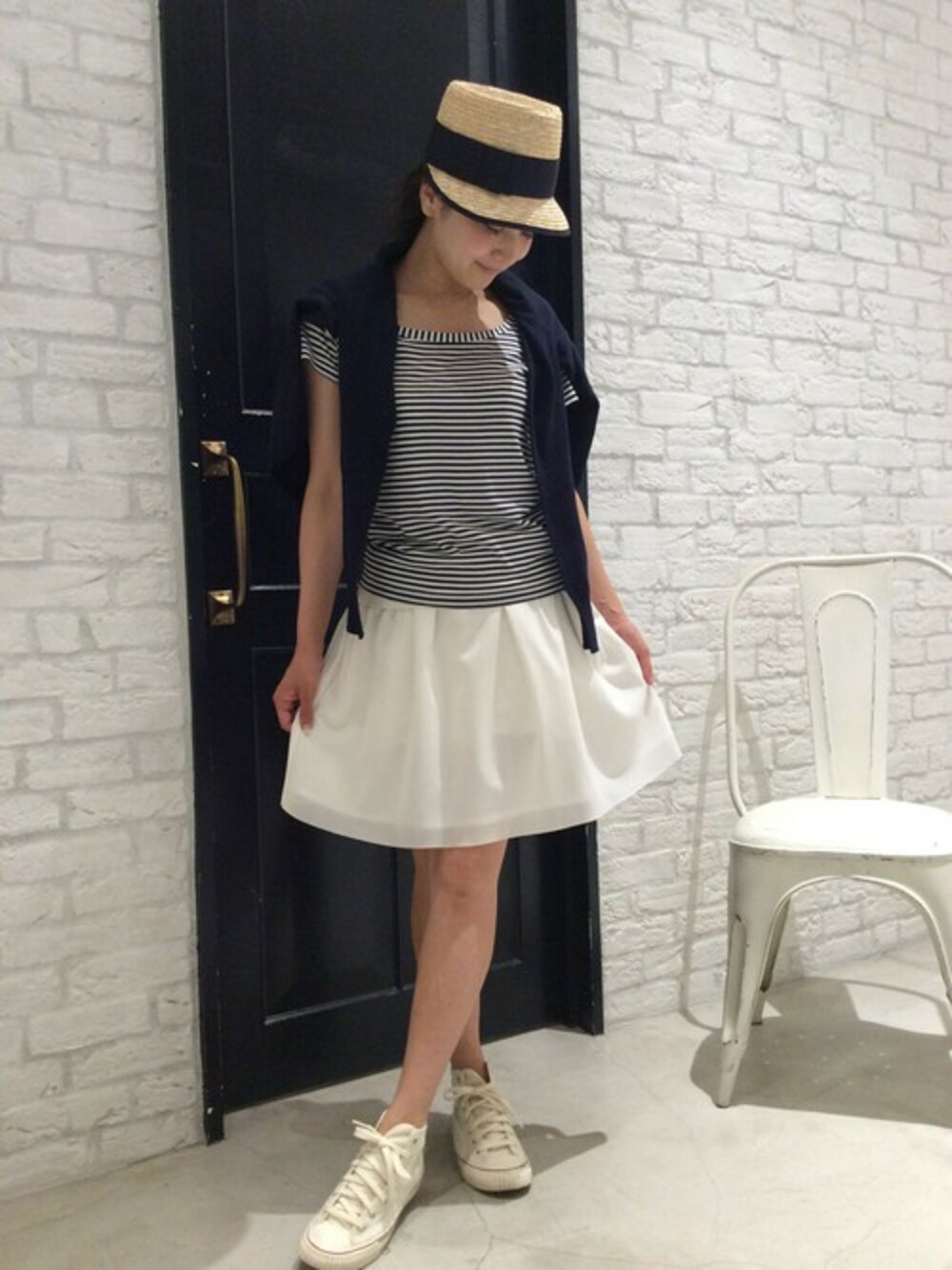 細いピッチのボーダーとチュールスカートで、大人っぽい雰囲気をキープしながらスニーカーでラフなスタイリングに!