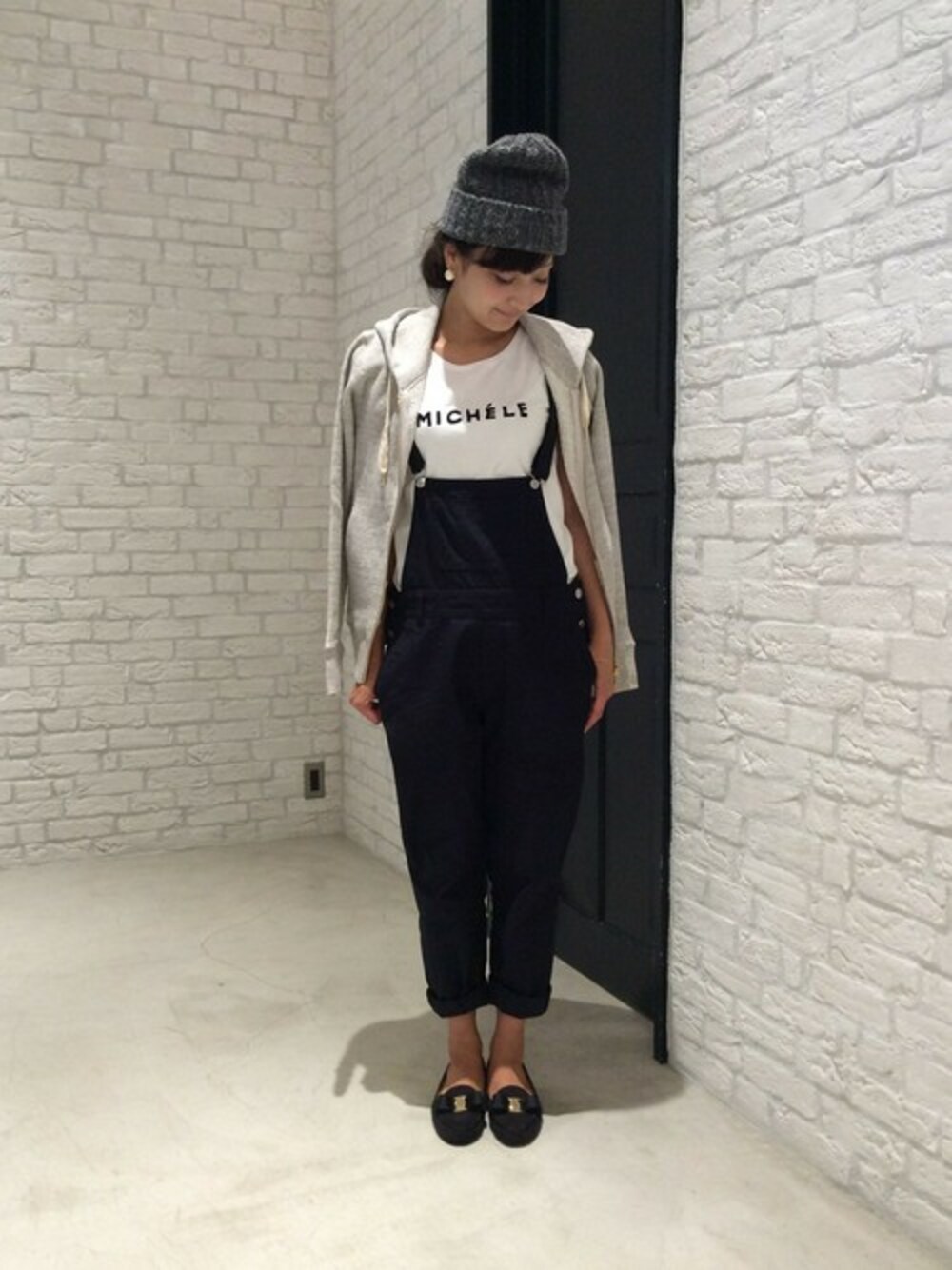 カジュアルなサロペットは、白Tシャツとのワンツーコーデでさっぱりとこなして!! ニット帽とパーカーを合わせて、カジュアル感の中にも可愛いらしさをプラスした大人カジュアルです!