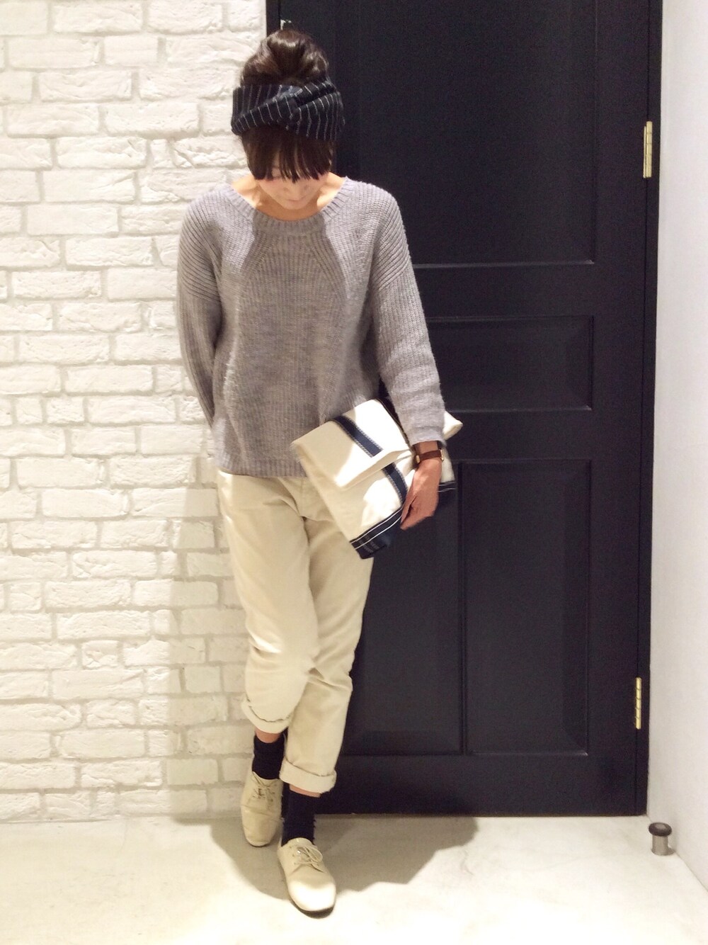 ライトグレーのセーターに白のパンツ+靴でちょっと春を意識しました。