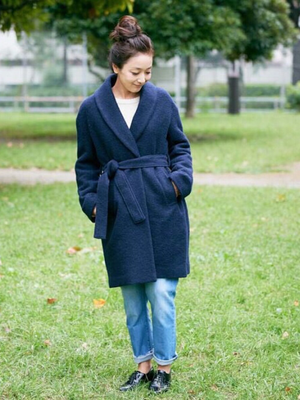mikikoのチェスターコート「スライバーニットショールカラーラップコート」を使ったコーディネート
