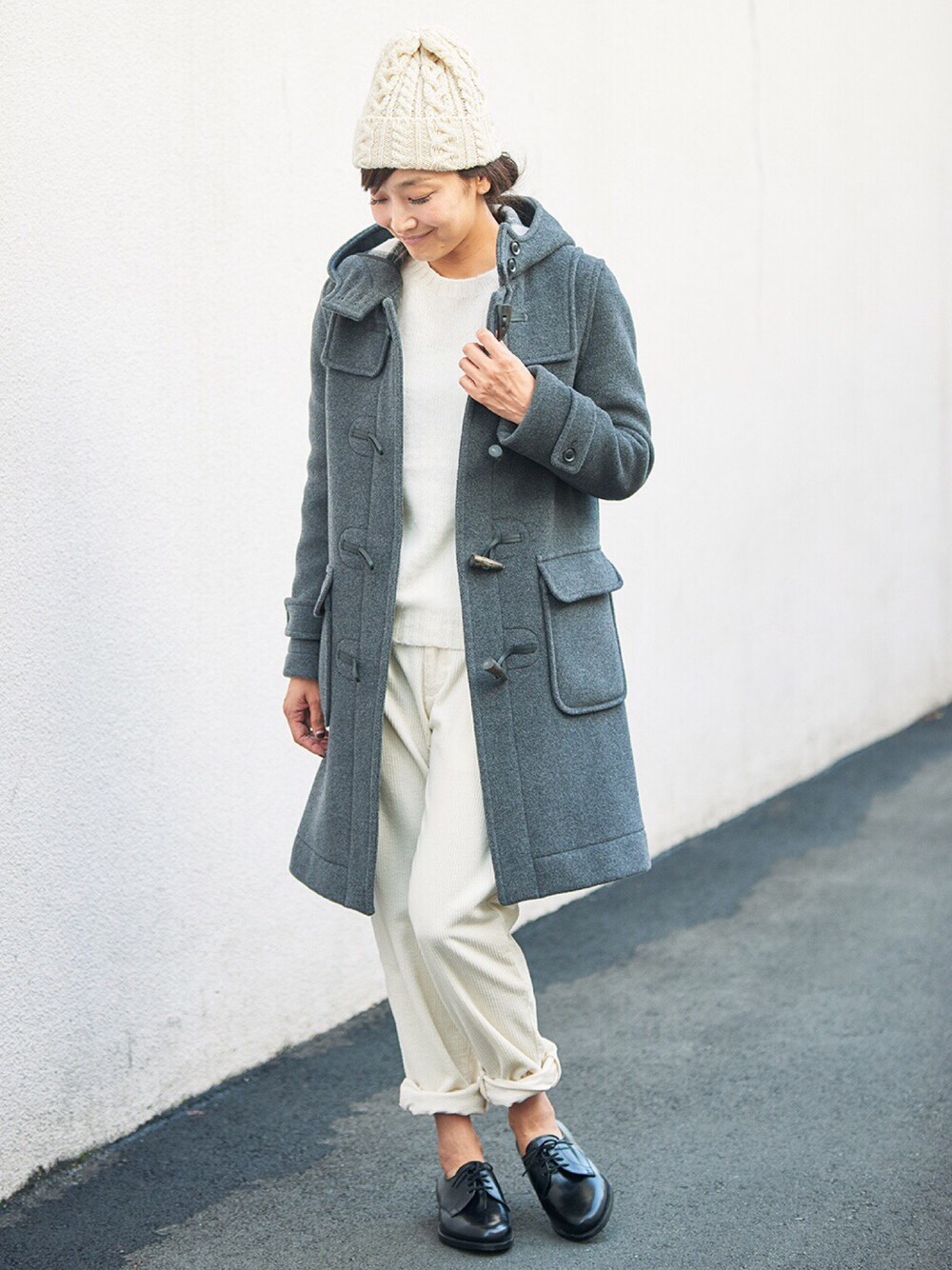 インナーはオール白にしたコートが主役のコーディネート!! 定番ダッフルコートは、いろいろなスタイリングが楽しめるのも魅力ですよね。