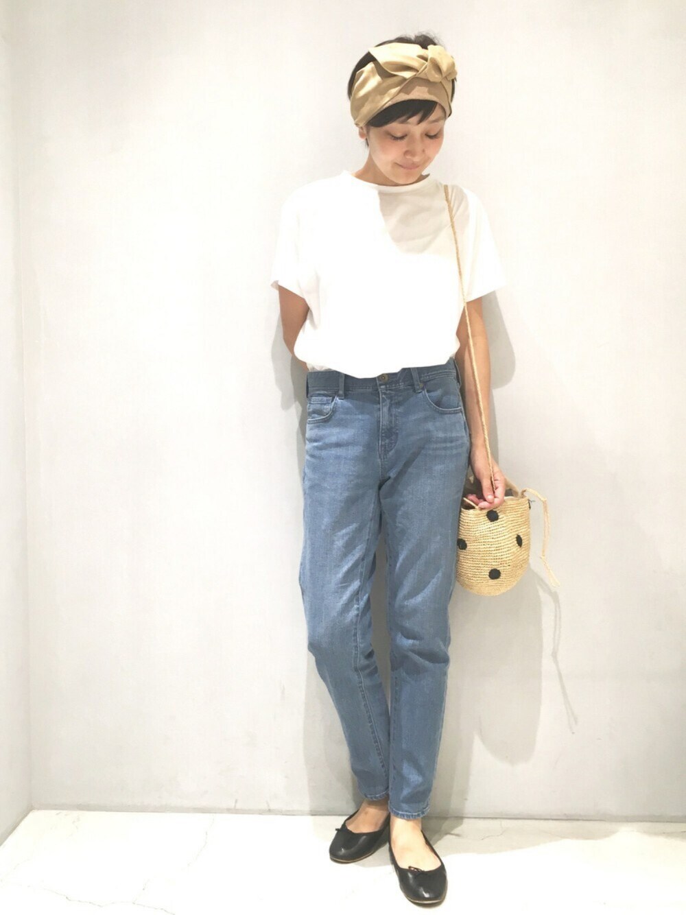白いTシャツにデニムパンツ。あえて野暮ったく着るのが今の気分♪♪クラシックなターバンとバレエシューズで可愛さをプラスして、脱マンネリ!!