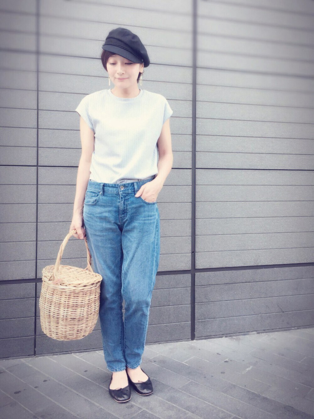 Tシャツ、デニム。シンプルなスタイリングにjanebasket、バレエシューズ、マリンキャップで大人のフレンチスタイルを演出。 トレンドに飽きるといつも戻ってきてしまう大好きなフレンチカジュアル♪♪