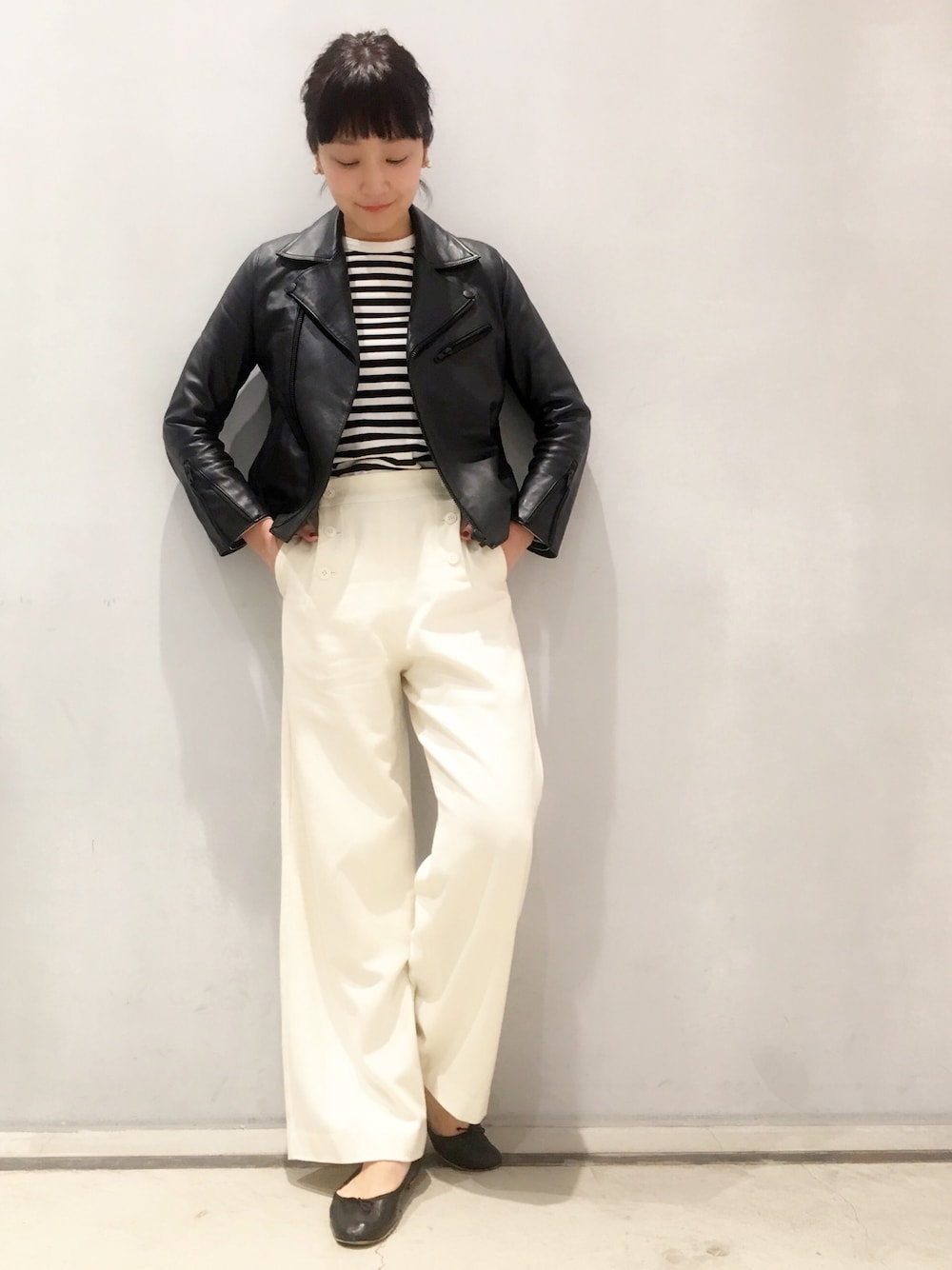 パリジェンヌ王道の組み合わせと言ってもいいくらい鉄板なスタイリング♪♪ ボーダーにマリンパンツをあわせたら、レザーのライダースでスタイリングにスパイスを!! 甘めなスタイリングが苦手な方も取り入れやすいコーディネートです!